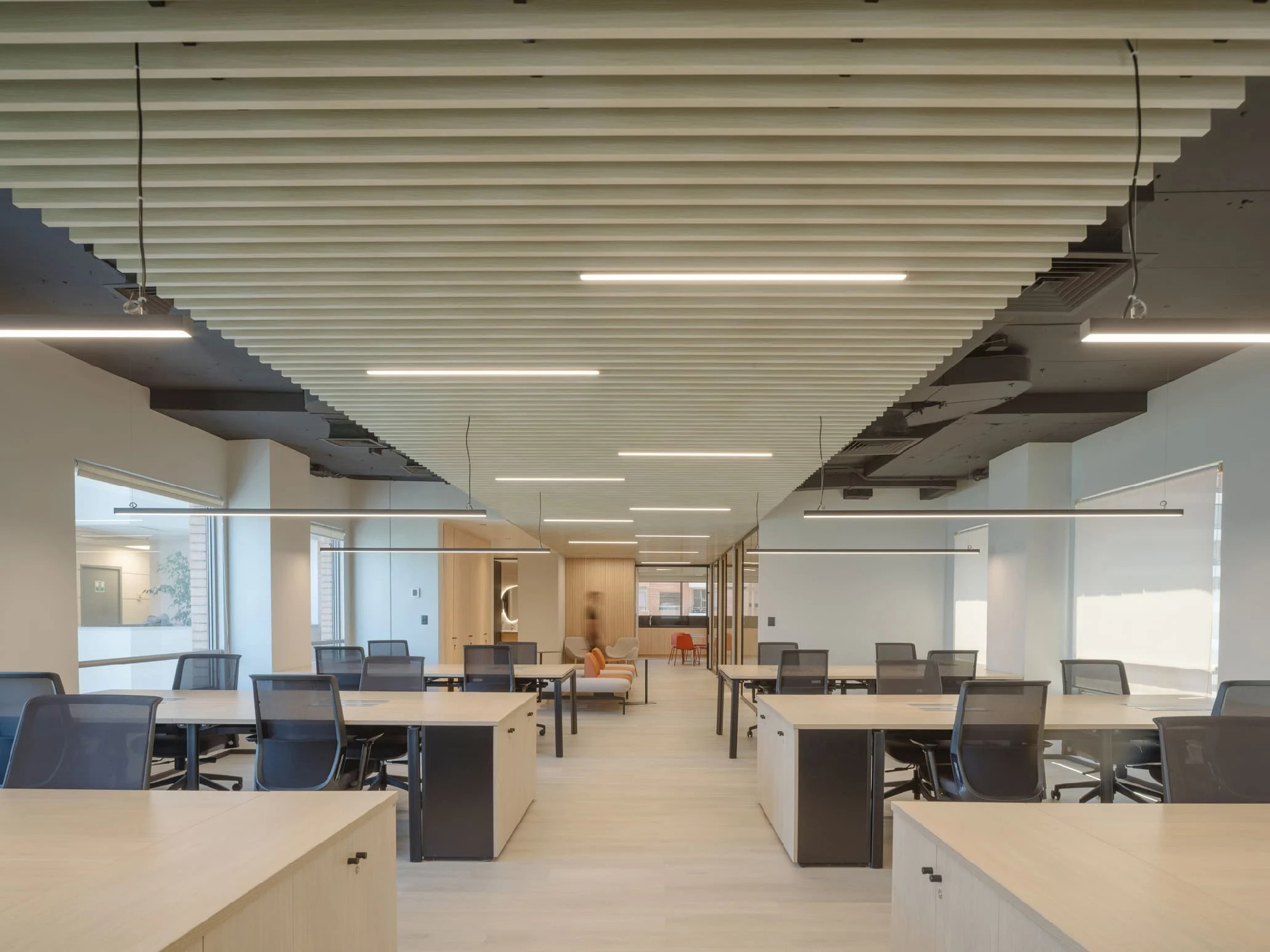 此次设计委托的另一核心述求是提升办公室的声学舒适度。为此,整个空间铺设了连续统一的乙烯基地板。同时,会议室采用绒面声学挡板吊顶,在降低层高的同时有效控制声场混响。