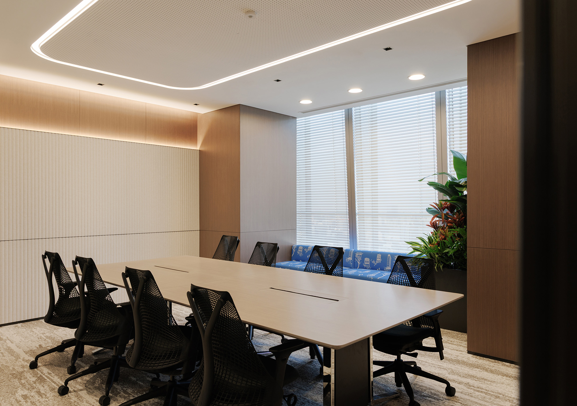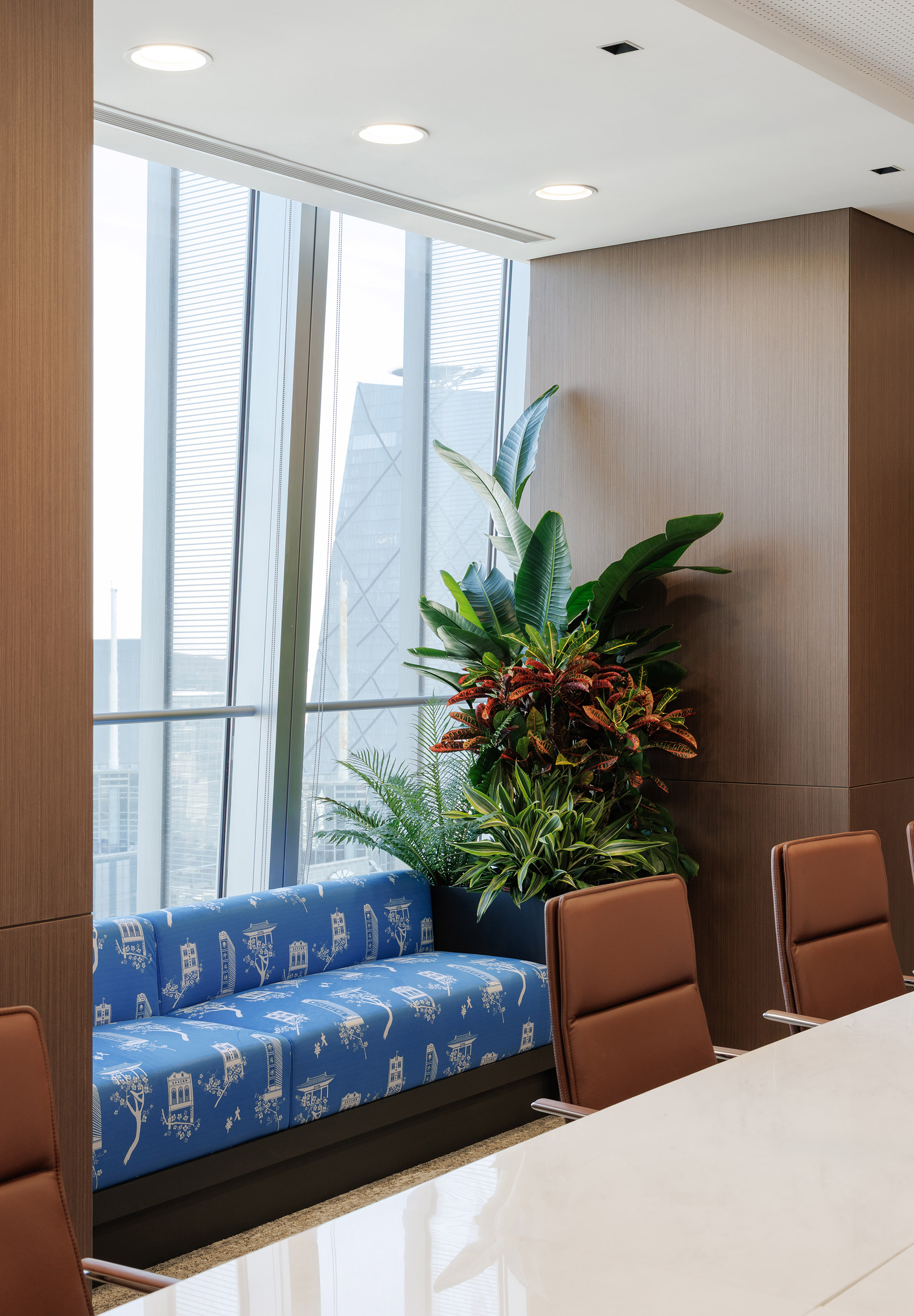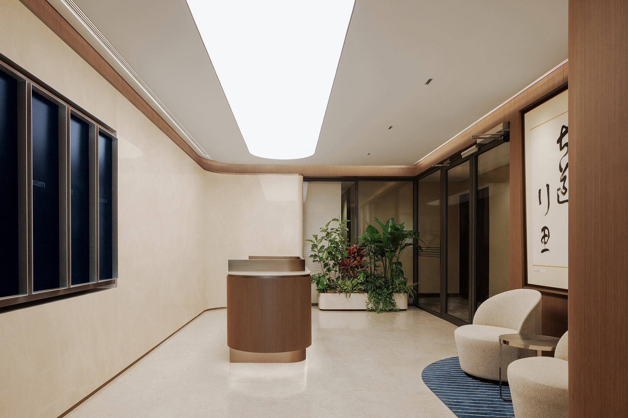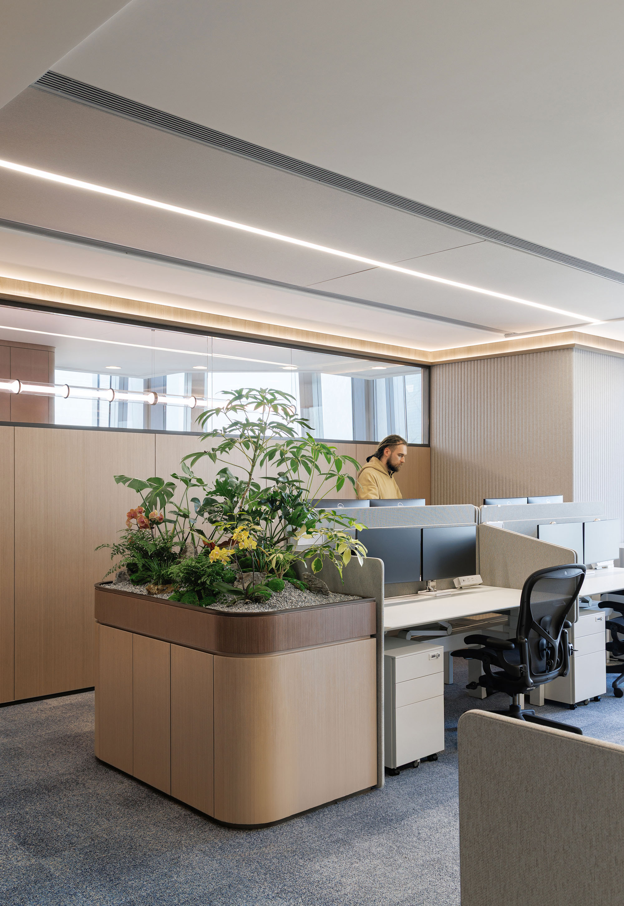 材料质感强调温暖与触感:米色石材、纹理橡木、胡桃木以及环保饰面构成了沉稳的基调,并辅以精心布置的绿植,含蓄地暗示了该客户的新加坡渊源。声学舒适性、人体工学系统与智能照明在整个空间中无缝集成,以含蓄而优雅的方式支持着工作环境的清晰度、专注度与能源绩效。