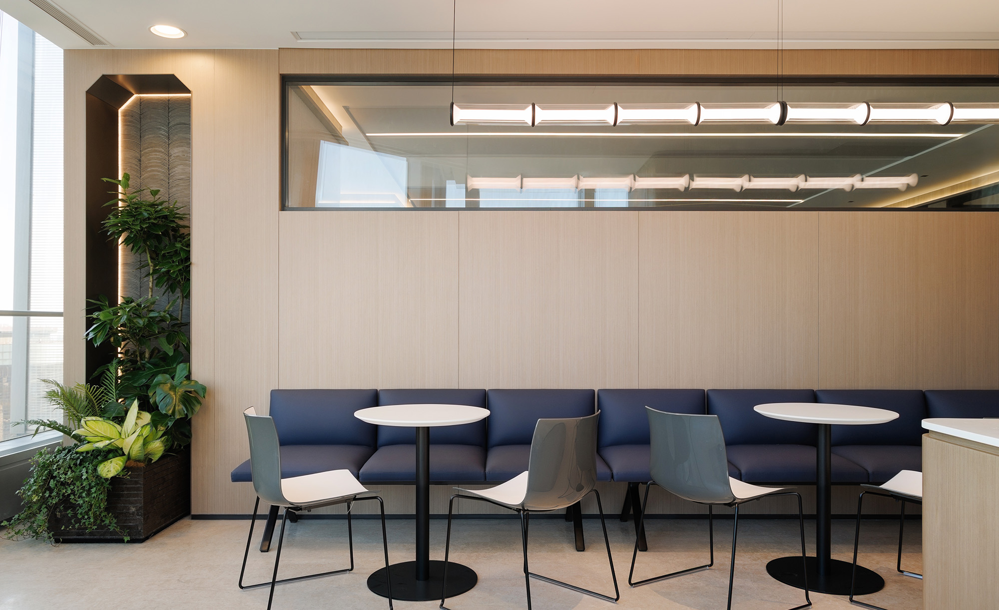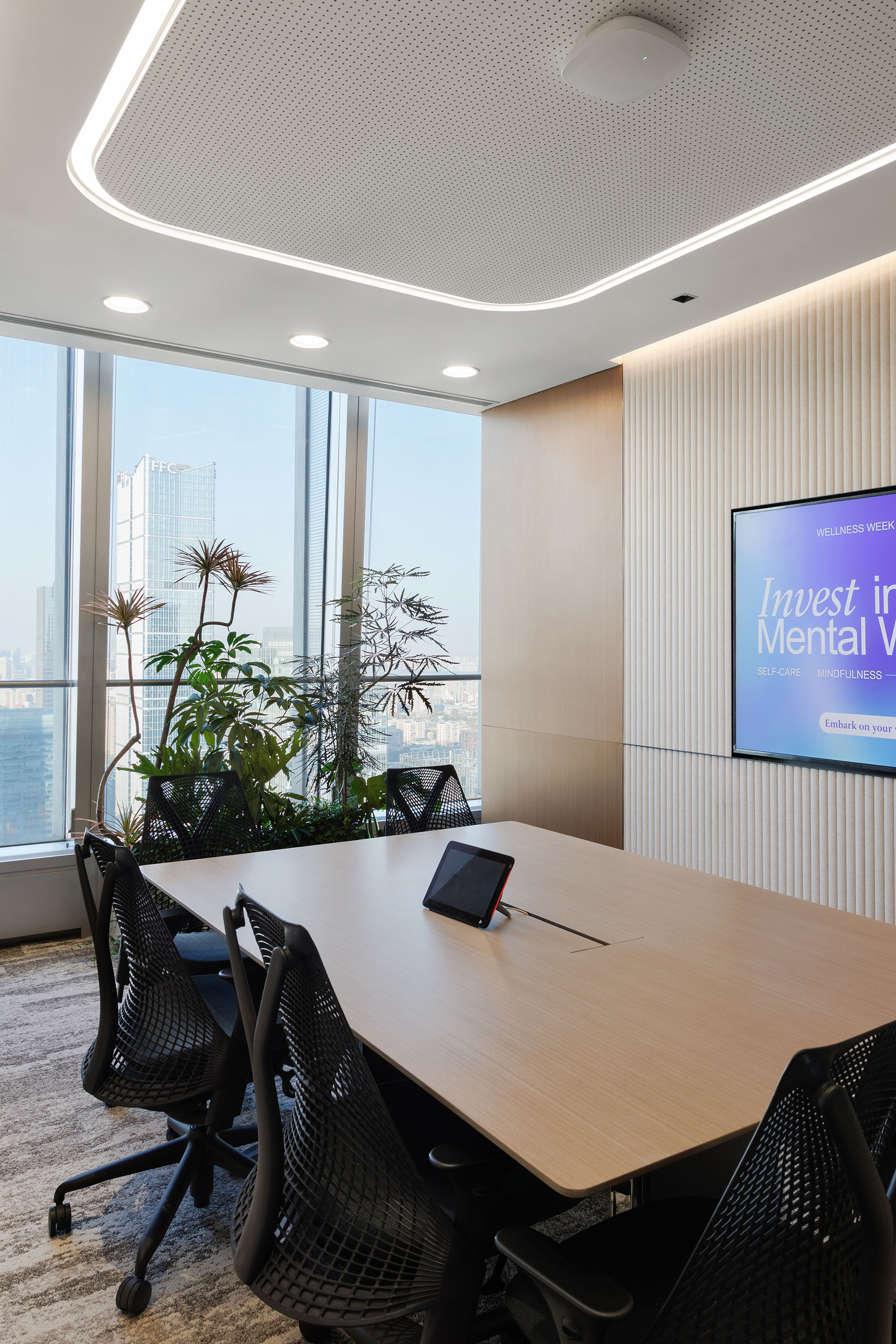 项目全面符合WELL与LEED标准,将健康、舒适和环境的可持续性置于设计哲学的核心。WELL原则通过提升空气质量、引入自然光、优化人体工学舒适度等设计特点得以体现,从而创造一个支持员工身心健康的办公环境。LEED合规性则通过高效节能的系统、可持续材料及节水装置实现,确保了整个空间资源利用的责任性。这些措施共同彰显了对打造高性能、环保型工作场所的承诺。