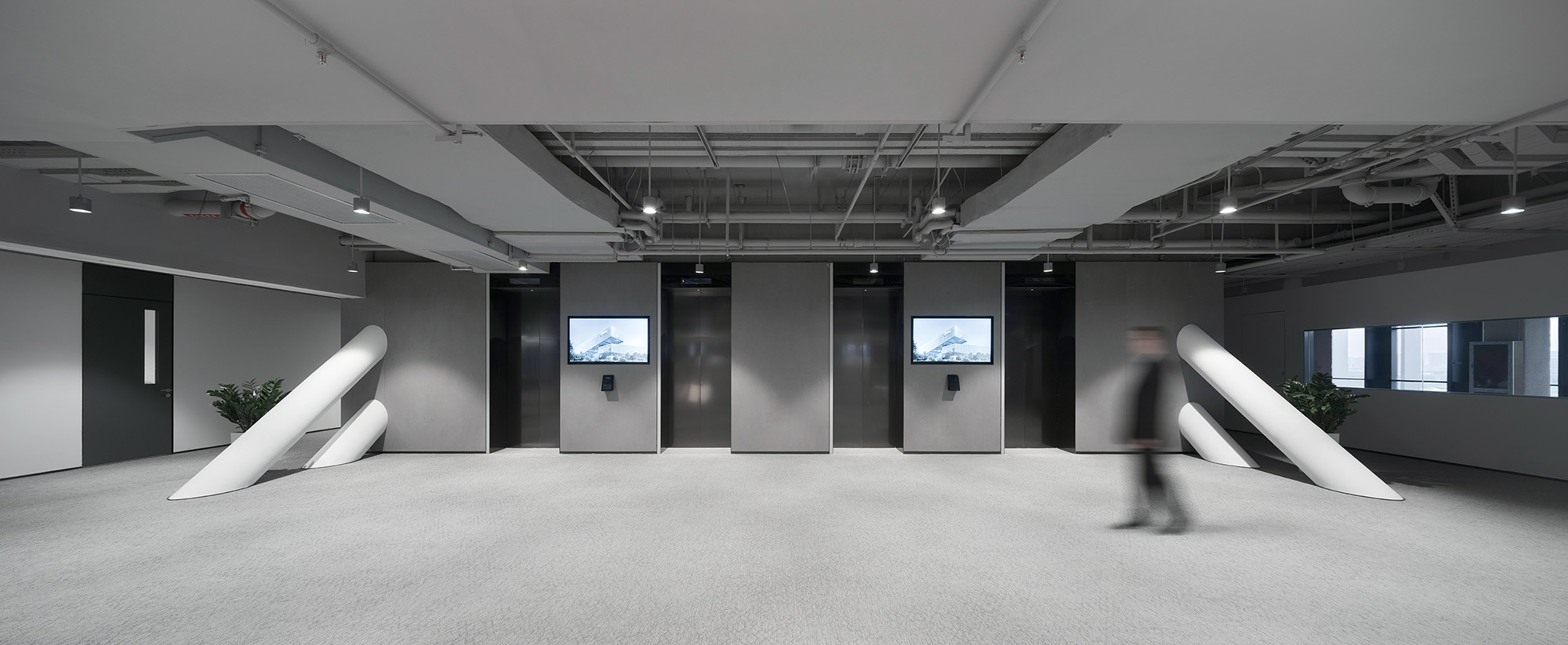 以大堂区域为例,高大的空间搭配简洁的线条,结合巧妙的灯光设计及超大屏幕,打造出极具视觉冲击力的科技感空间。