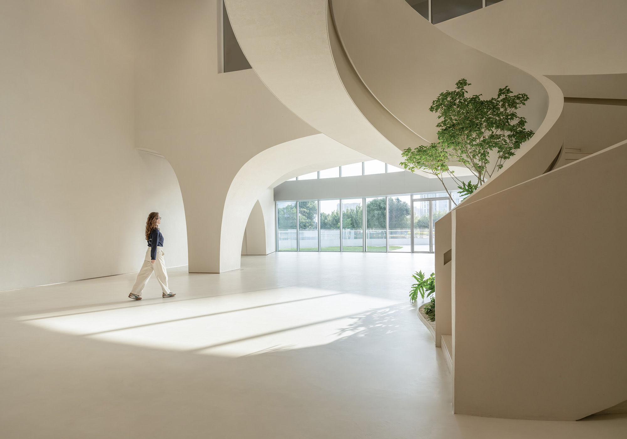 天空门户——多功能厅、培训与休闲空间,象征通往更高维度的探索;大地门户——餐厅、员工设施等生活支持空间,构建稳定而有温度的日常体验。空间不再是静态的分区,而是推动体验不断展开的“关卡”。
