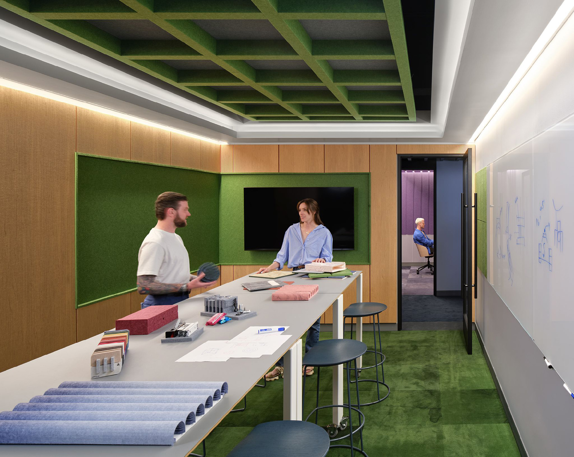 作为Turf位于伊利诺伊州吉尔伯茨工厂的微型缩影,原型实验室让客户与合作伙伴得以直击Turf产品线与研发流程,并与设计团队实时协同共创。现场配备Turf自有全尺寸CNC数控机床——这套集切割与标记功能于一体的系统,正是Turf将毛毡转化为声学解决方案的核心设备——客户与访客将深度见证Turf设计流程从构思到成品的完整闭环。