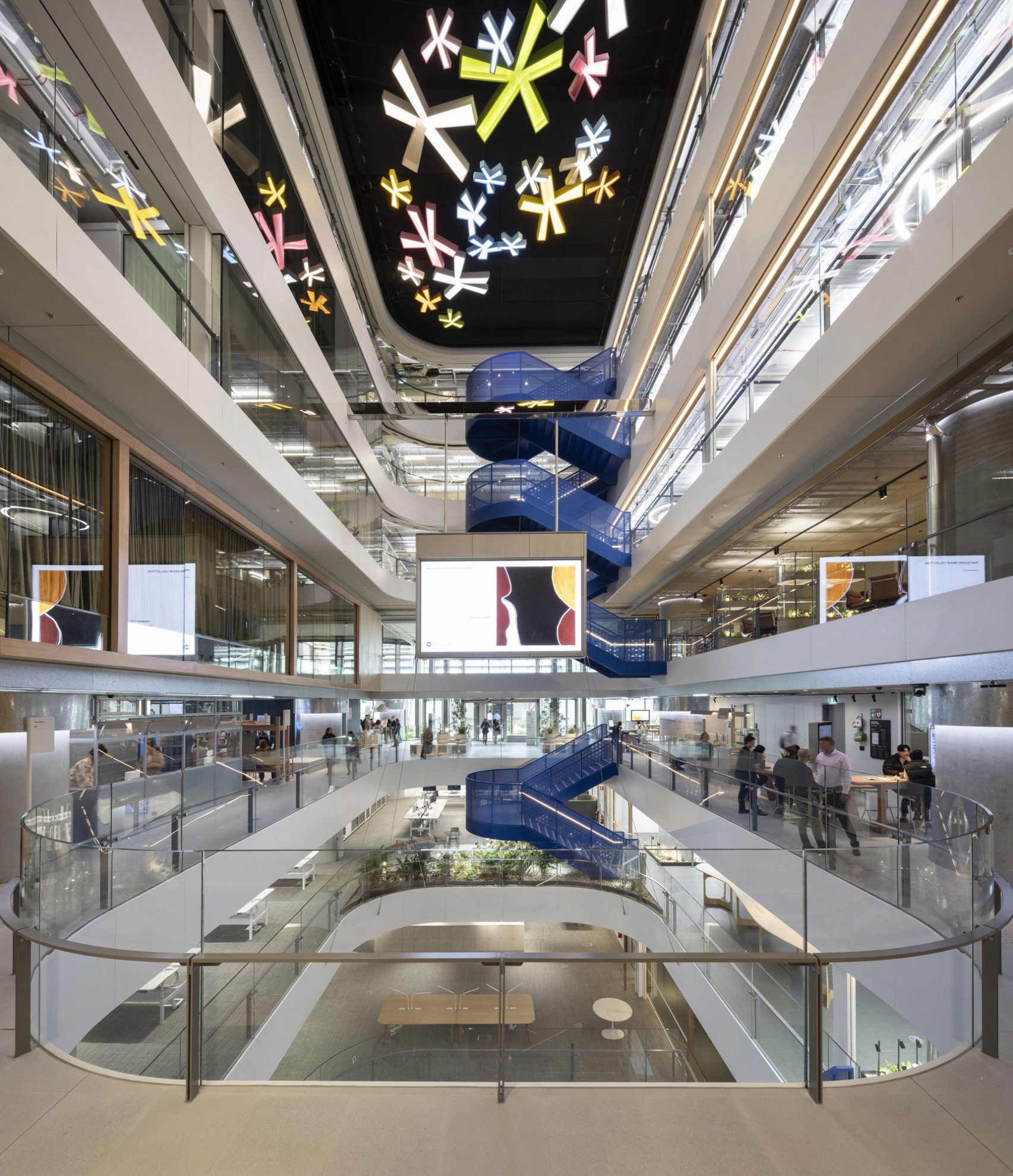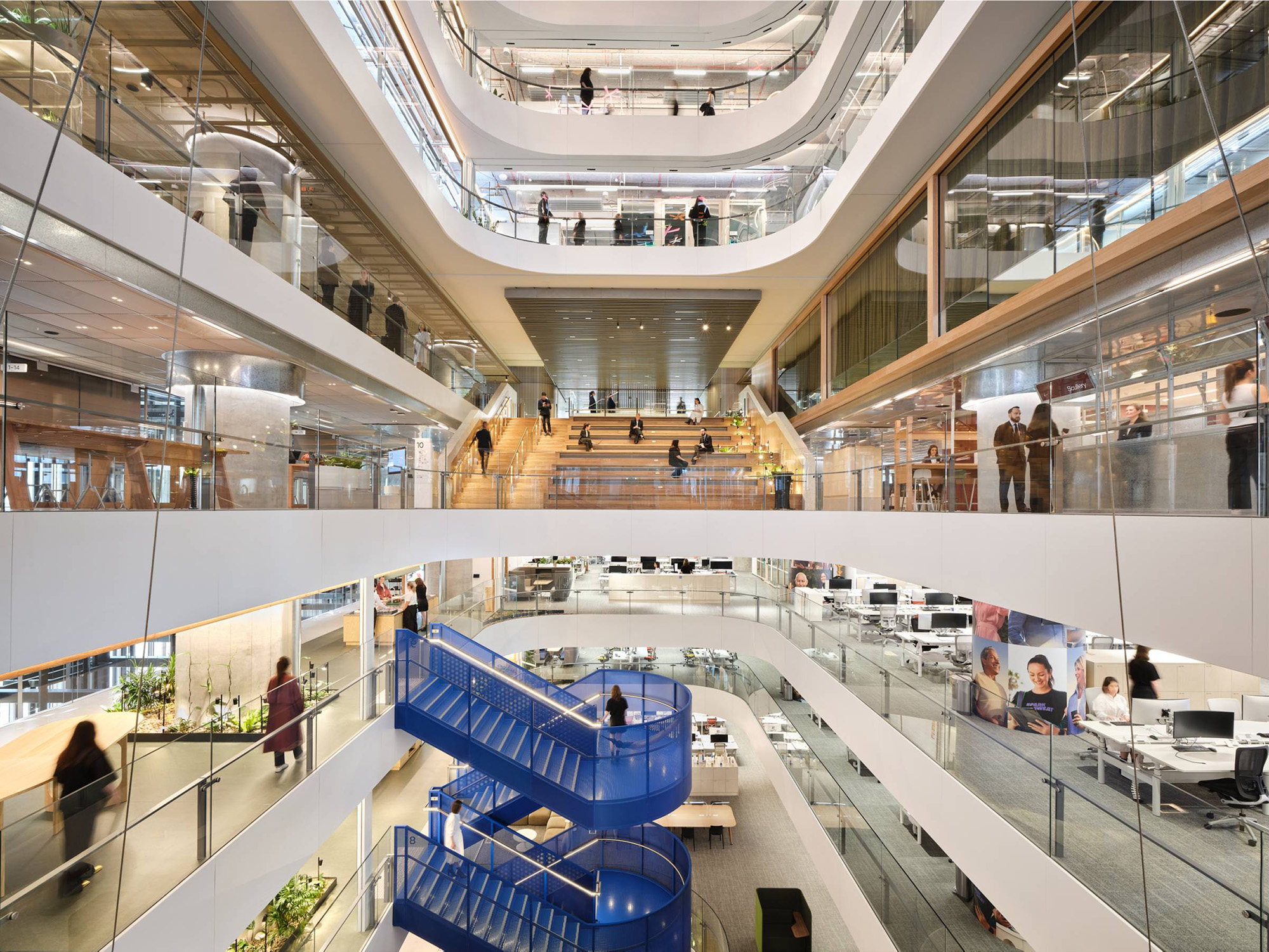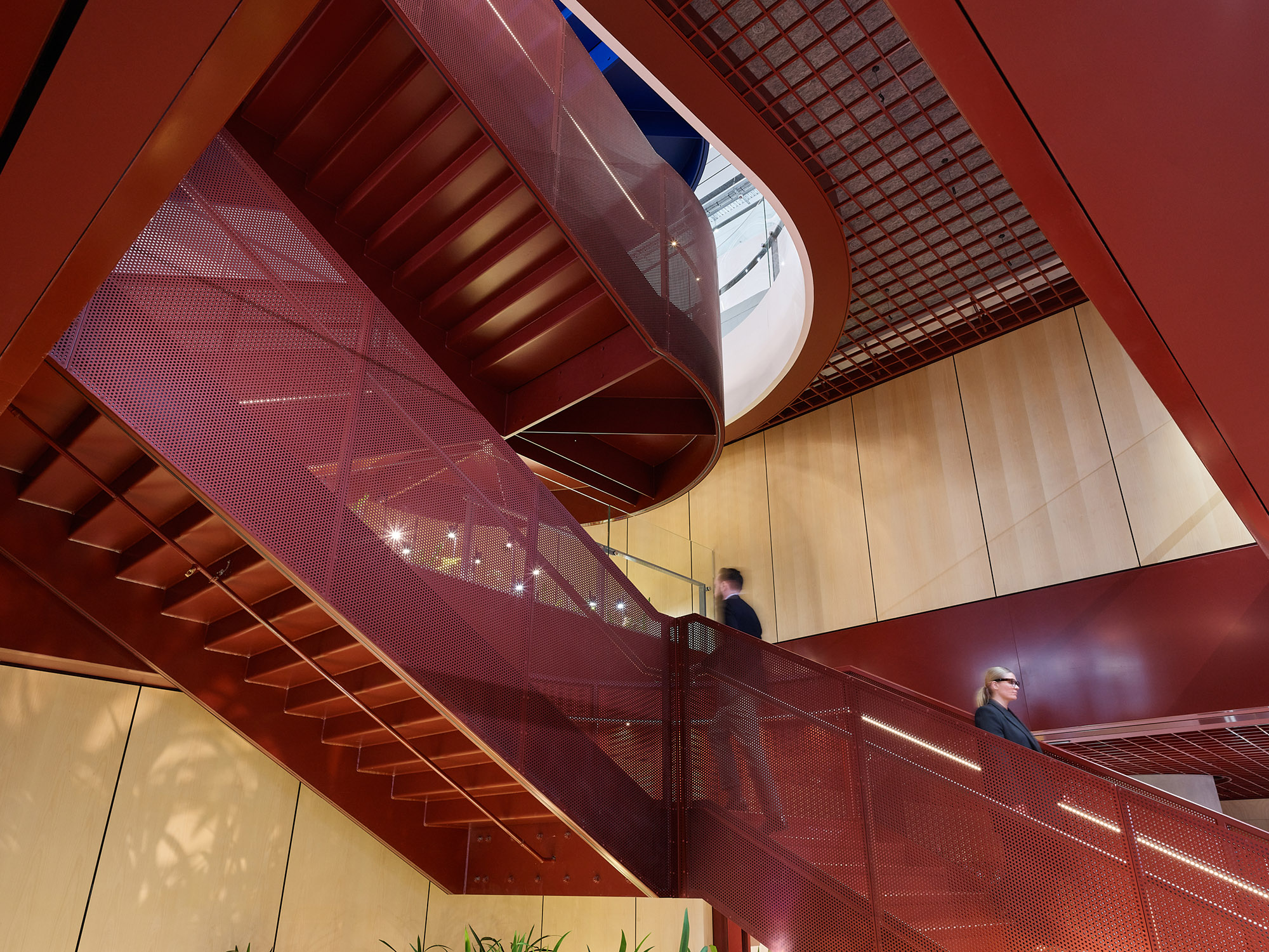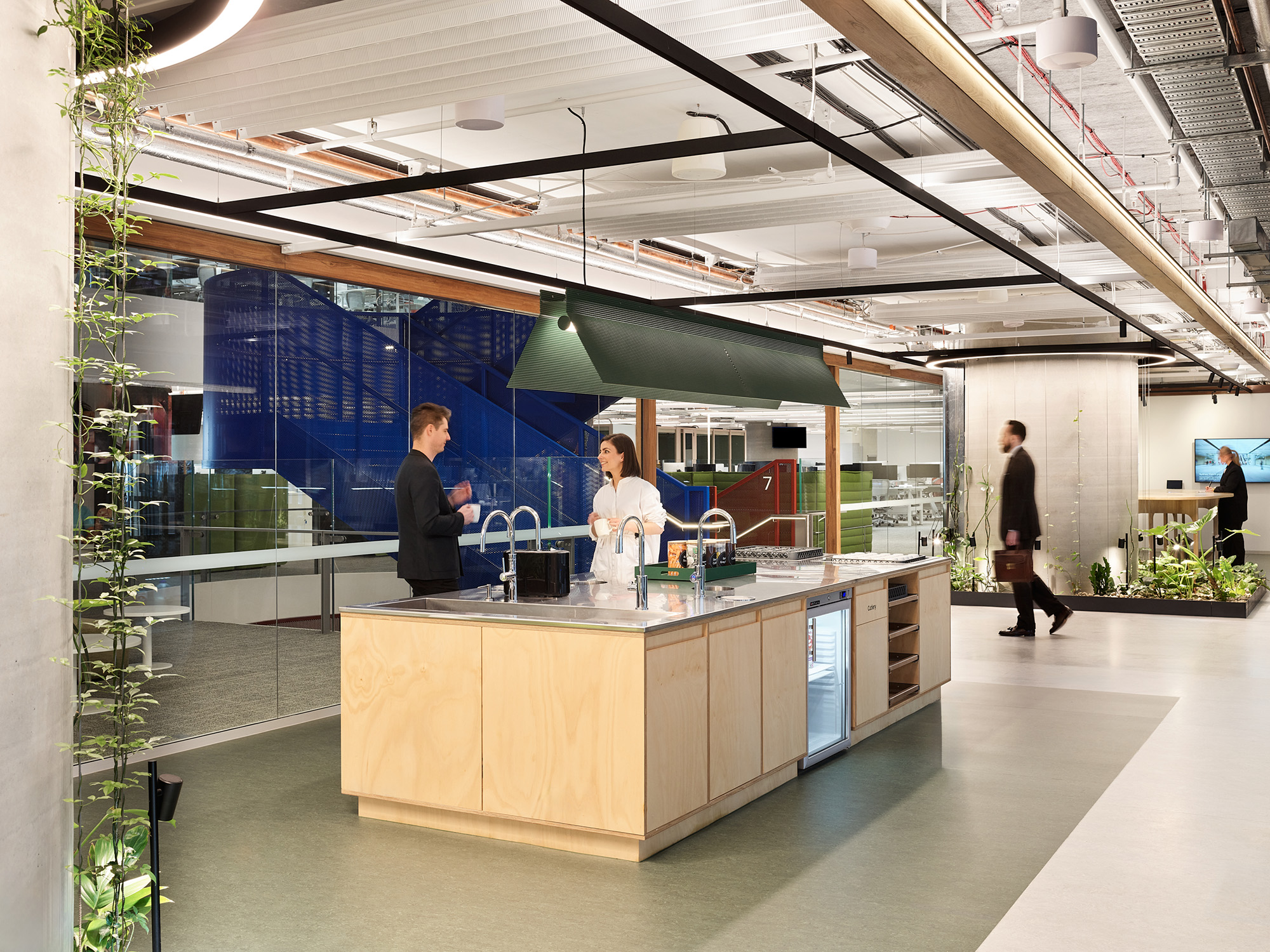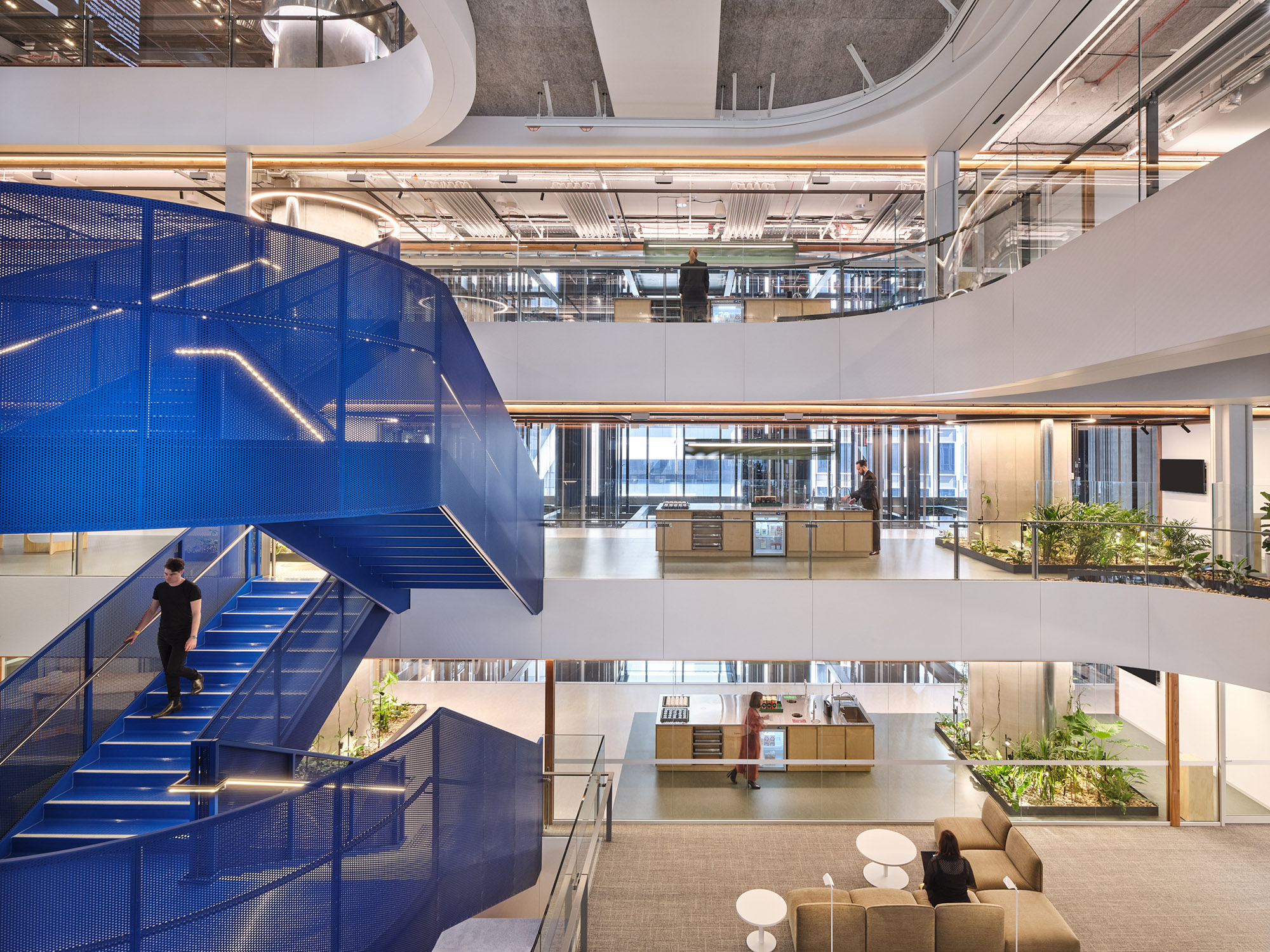 横跨中庭的是一座醒目的钢制楼梯,其采用了“悉尼蓝”色调,令人联想到这座城市的天际线与海港风光。这座楼梯贯通所有办公楼层,旨在鼓励非正式的互动交流,并形成贯穿整栋建筑的开放视野,从而增强空间的连通性。