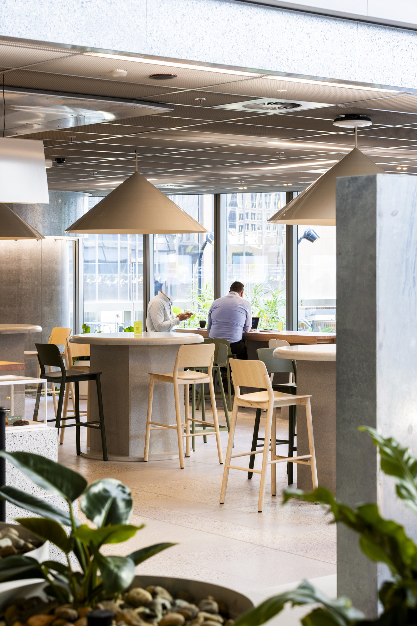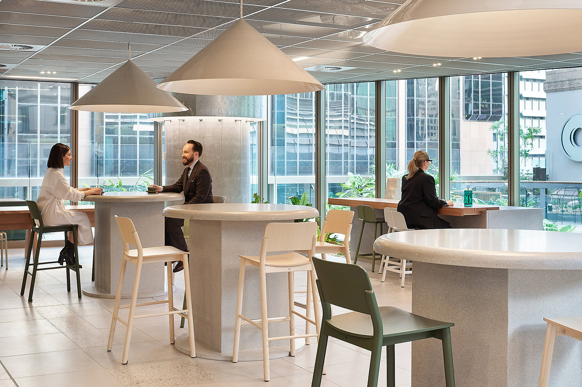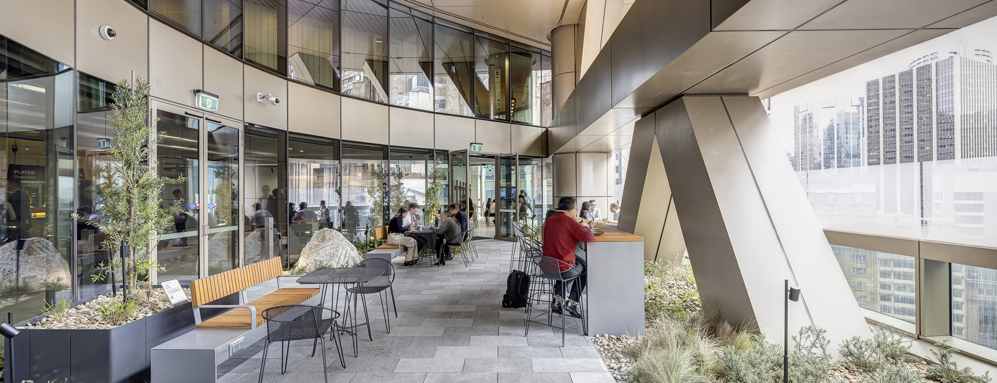 与Hecker Guthrie设计事务所合作打造的一整层空间,专为社交款待而设,设有美食集市、用餐区和一间咖啡馆,旨在促进员工交流,营造社区归属感。