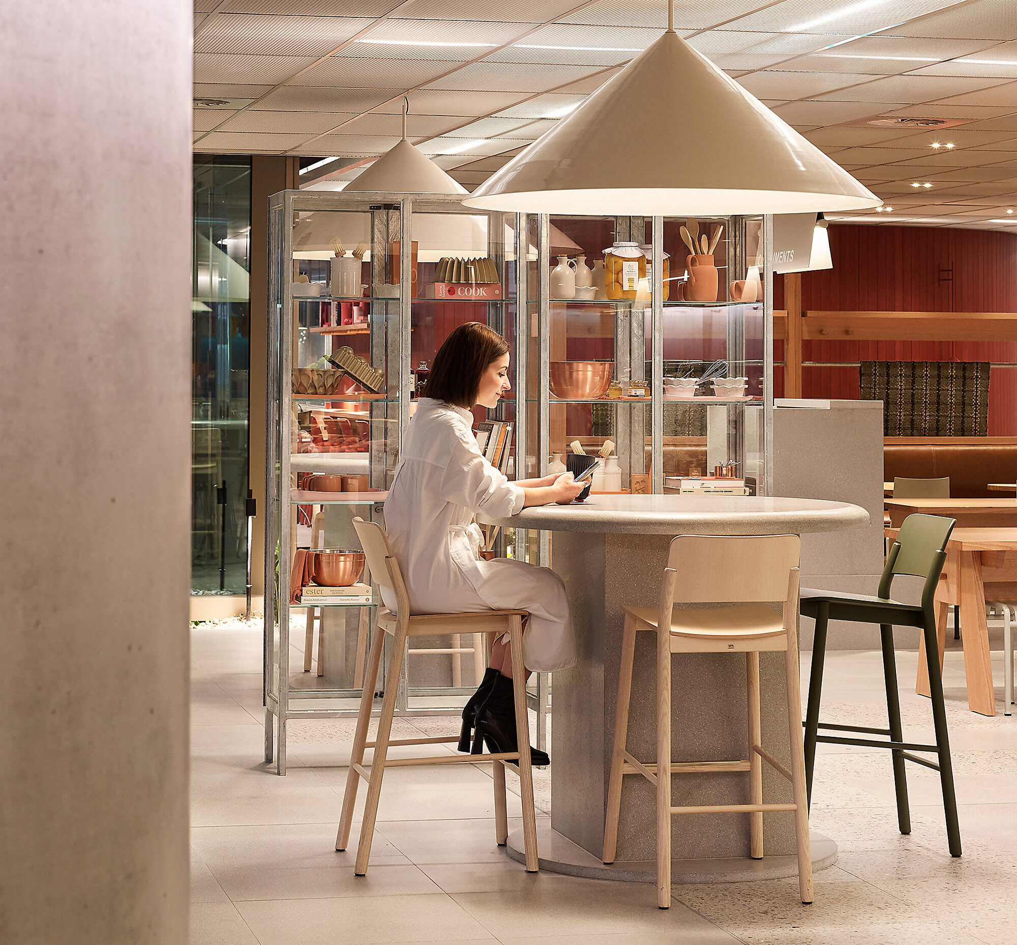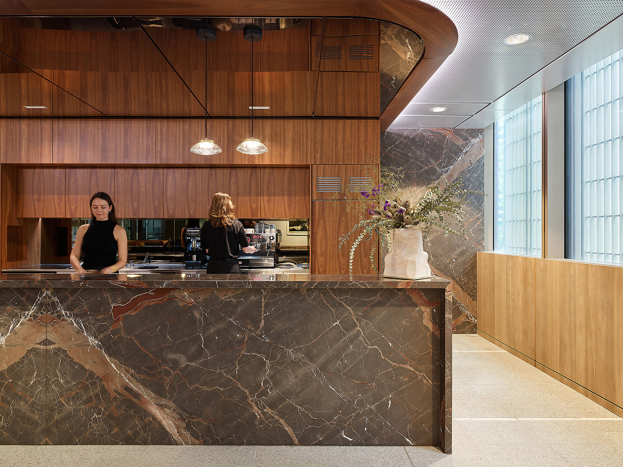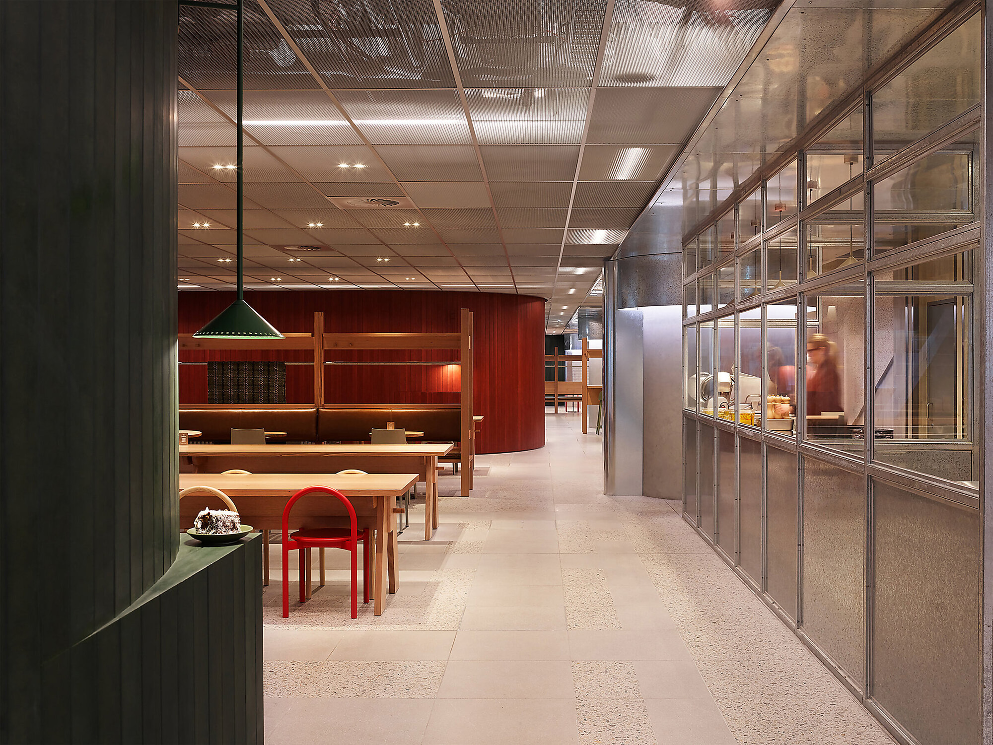 与Hecker Guthrie设计事务所合作打造的一整层空间,专为社交款待而设,设有美食集市、用餐区和一间咖啡馆,旨在促进员工交流,营造社区归属感。