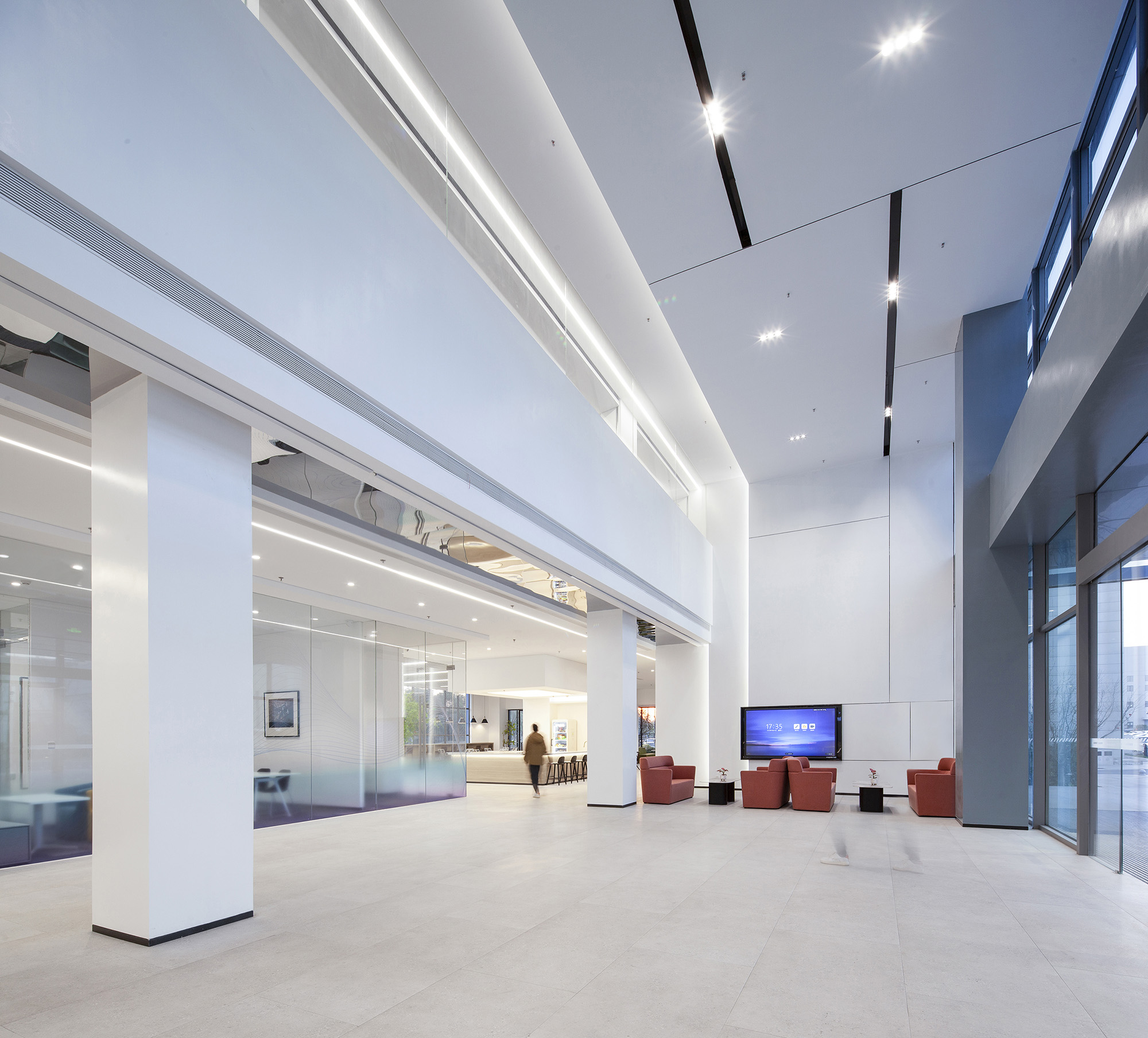 二层办公空间与首层大堂的分隔墙体,其上半段采用通透玻璃隔墙设计。这一处理既从立面维度丰富了大堂的空间层次,又使二层内侧办公区得以间接引入大堂的自然光线,让整体空间的光环境更显舒适宜人。