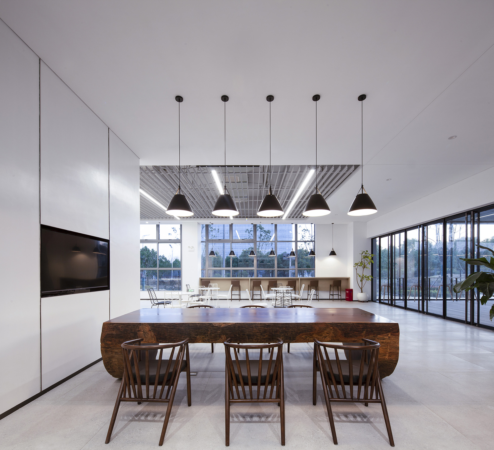 标准办公楼层中,设置了多处可切换使用场景的共享空间,兼具灵动办公与休闲分享功能。空间处理以硬朗洗练为基调,营造出富有速率感与光感的空间氛围,与芯碁的事业特质形成完美呼应。