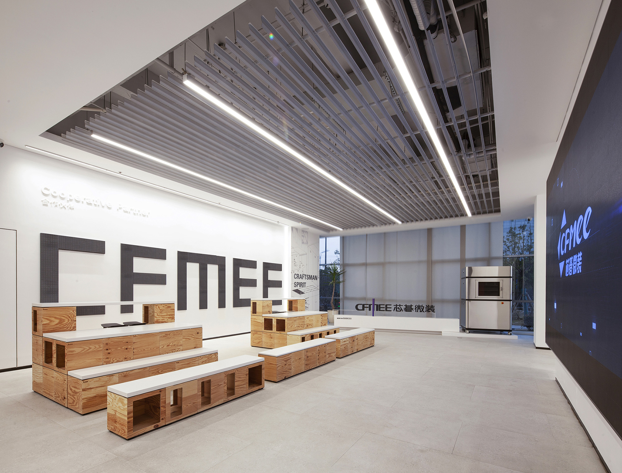 朝向外窗的台阶式分段墙体上,依次布置企业介绍(芯碁)、发展历程、技术专利及分享区等展示模块。开放式的空间布局,让客户接待与参访体验更显灵活友好。