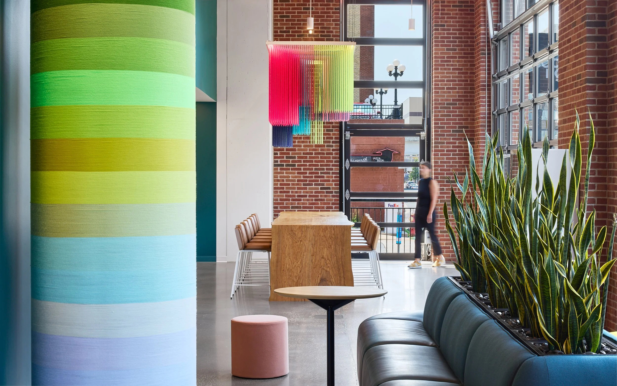 空间内有很多巨大的混凝土建筑立柱,且十分醒目。设计团队与艺术家 HOTTEA共创,用与设计色调相呼应的纱线将这些柱子包裹起来,并将这些面向街道的柱体配以定制灯光设计,使其在任何时段都保持高调可见度和活力感。这种巧妙地设计也成为该机构理念的延伸——社交优先、充满动感、富有创意。通过将临街的零售店面转变为以社交为核心的办公总部,这个项目重新定义了创意公司如何在社区环境中工作与自我呈现。