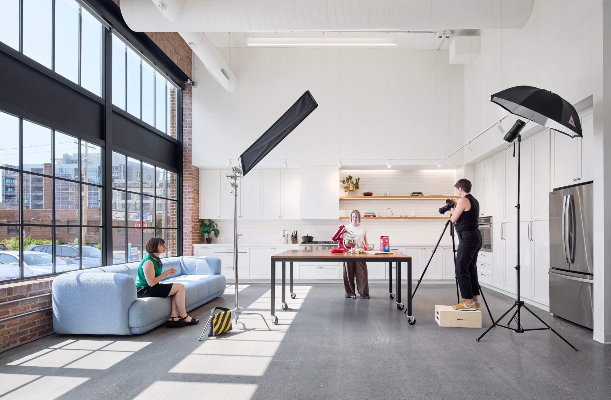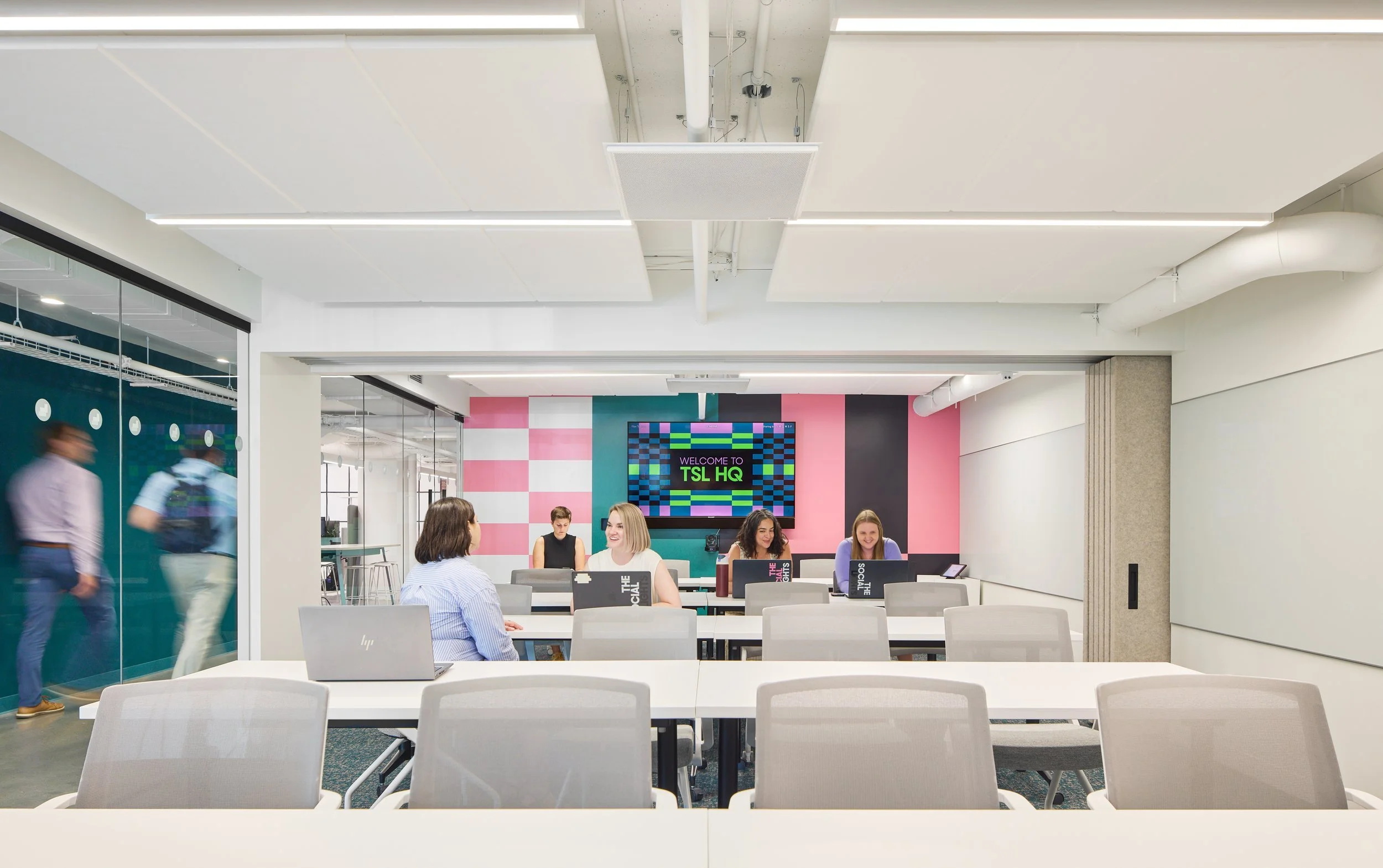 该空间在临街处设有一个专属的进出大门。进门后是一个仅有2.44米高的空间区域——营造出一种紧凑的空间感,并形成清晰的第一印象。温馨的接待台、充足的储物空间、舒适的休息区以及一块定制的霓虹灯标识,让人立刻感受到品牌的独特个性。在建筑布局上,一间灵活可变的培训室、一间宽敞的会议室,以及一间采光充足的内容创作室,均紧邻入口区域,并通过间隔设置的玻璃窗保持通透的视线。人们从外部可以看到这些空间内的活动,从而直观地展示他们的工作内容,也让整个空间充满动感与活力——正如客户所创作的作品一样。