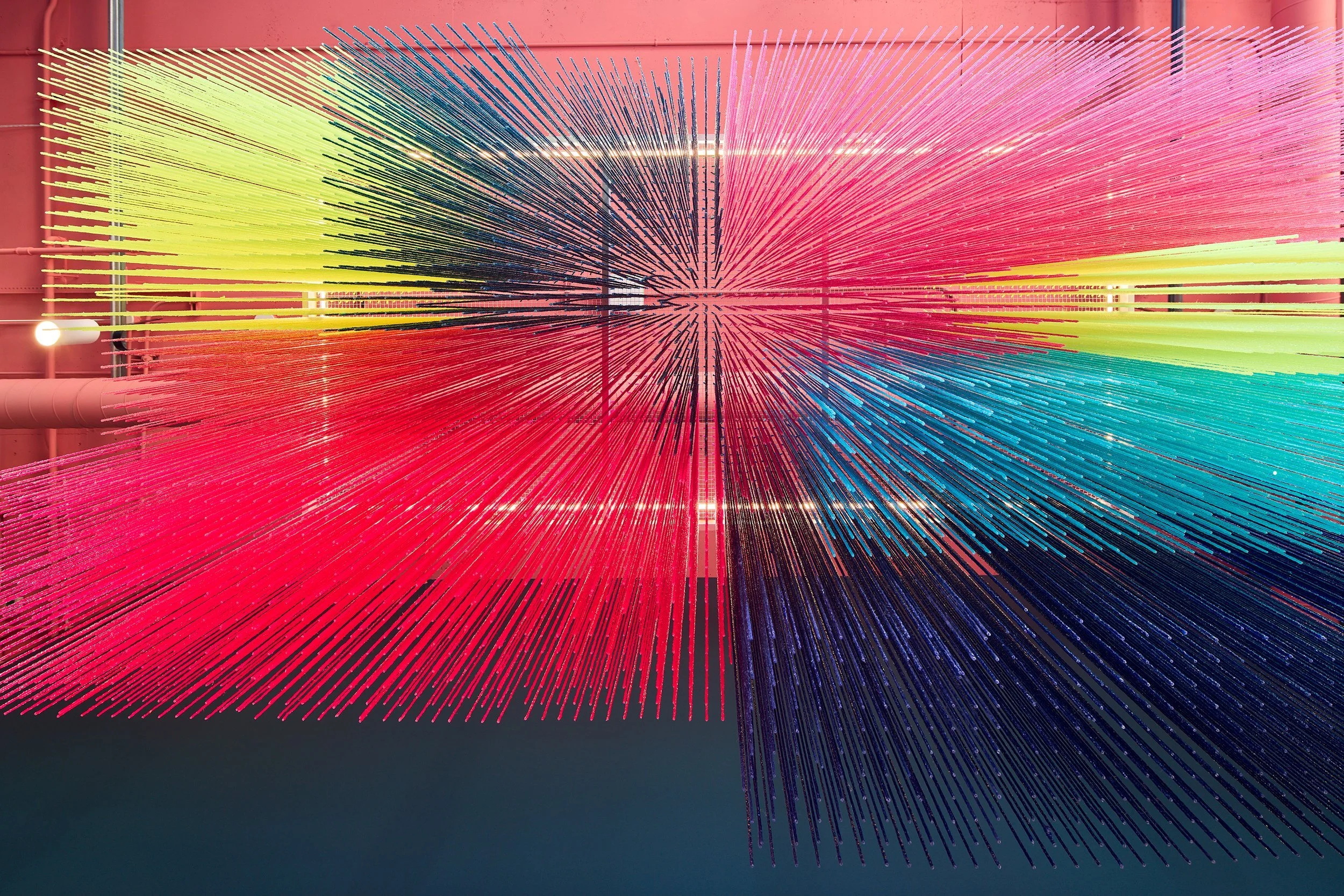 位于空间最前方的咖啡区和开放式工作区,充分体现了该空间的公共属性。面向街道的卷帘门为人们提供了白天和夜晚都能清晰看到空间内部的机会。设计团队与知名艺术家HOTTEA合作,创作了一幅色彩鲜艳的定制艺术/灯光装置,悬挂在岛台上方,打造出一个从街道上便可看见的标志性体验。这些艺术装置用色十分大胆,并与整个空间所使用的颜色形成了动态呼应的关系。