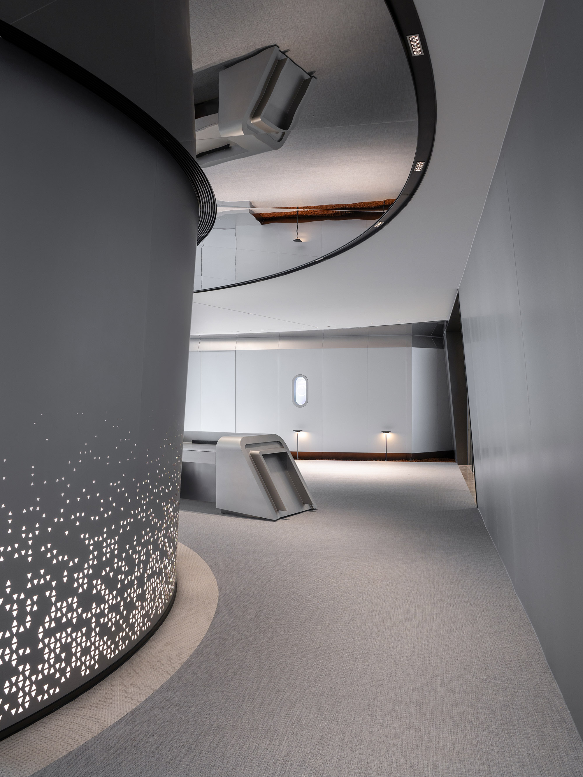 当电梯门打开的瞬间,体验即刻开始。设计并没有急于堆砌科技感,而是通过同色系和材质的天花与立面的极致延伸,消解了层高的限制,制造了一种“无限纵深”的错觉。你不再是站在写字楼的走廊里,而是站在通往舰桥的“气闸舱”,星际电梯厅化身为时空折叠的入口。