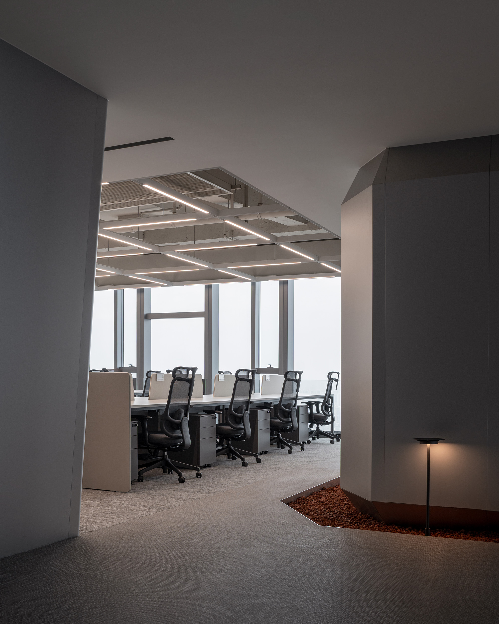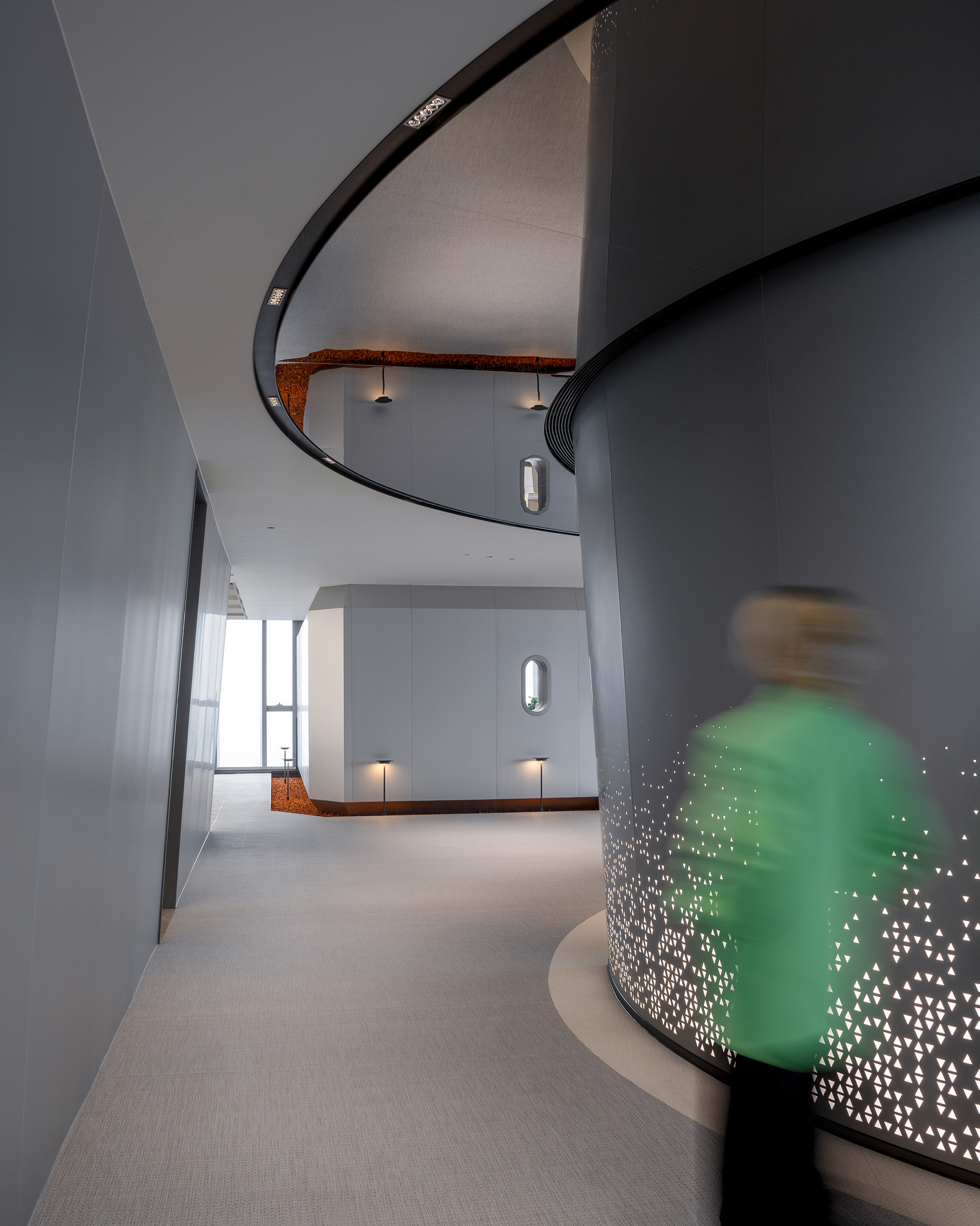 如果说前面的主接待区域是宏大的叙事与宣言,那么办公区域和穿插的辅助功能区,则进入了 “漫游” 阶段。