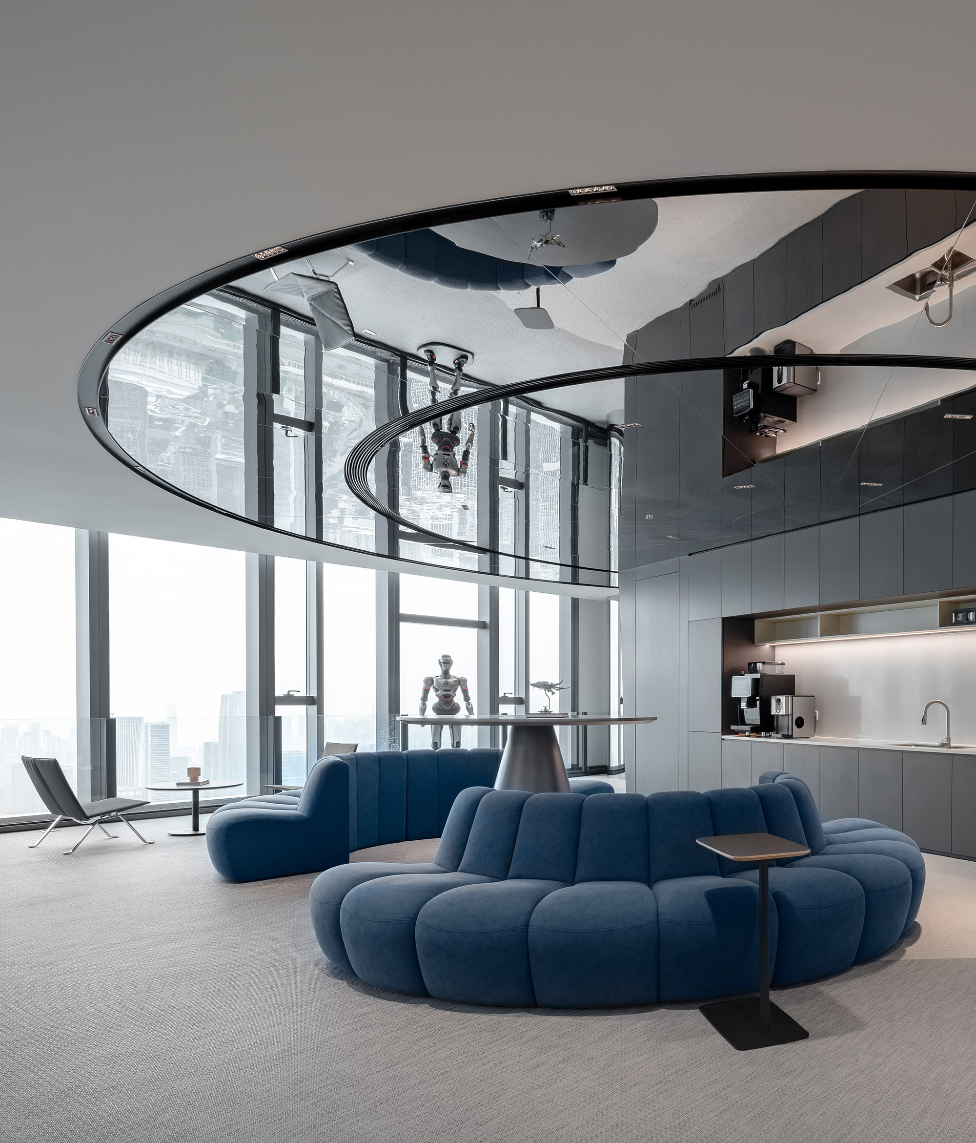 接待大厅的一侧是全景落地窗,光线和视野极佳,尽享深圳湾云端美景。深蓝色的柔软造型沙发让现代科技的空间多了一丝舒适与松弛,窗边矗立着一个机器人作为艺术装置,极具未来科技感,预示着远征的开始。