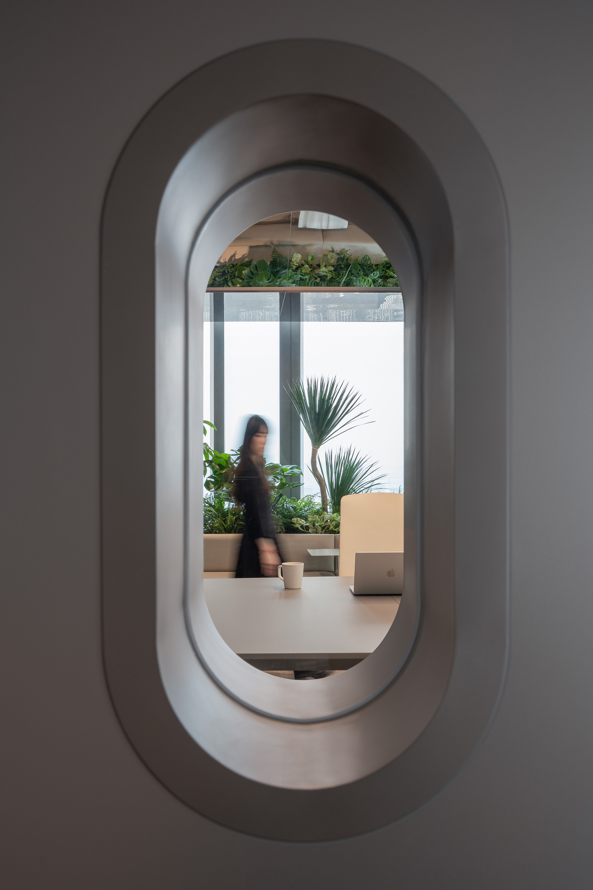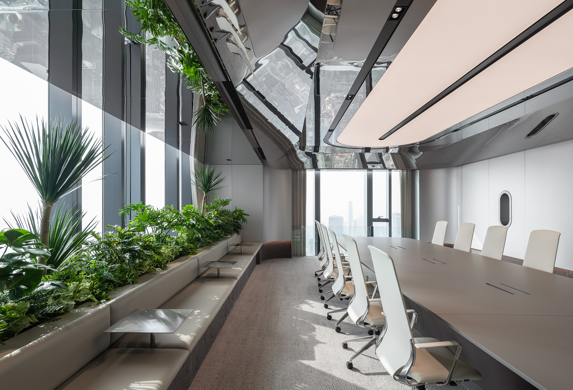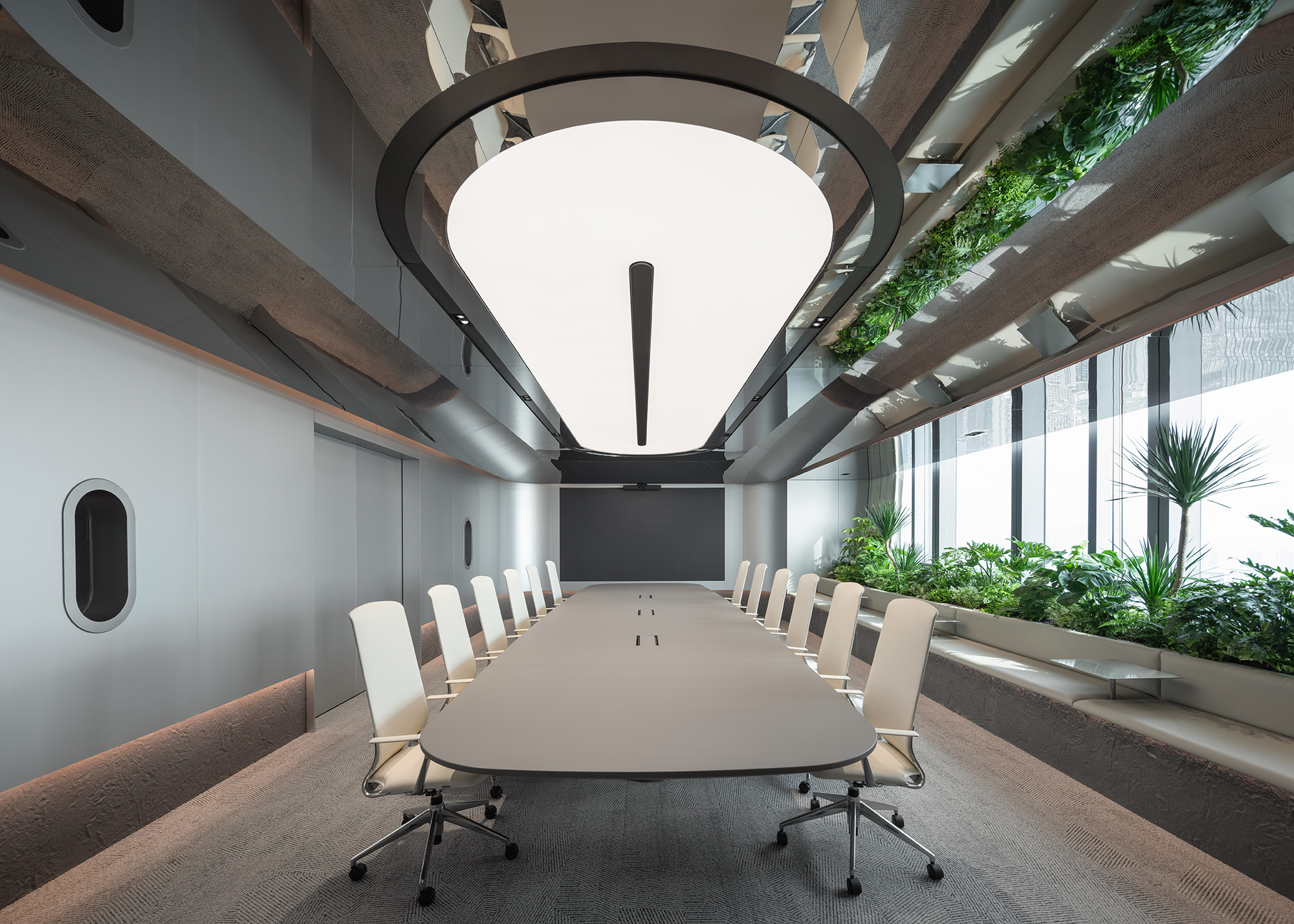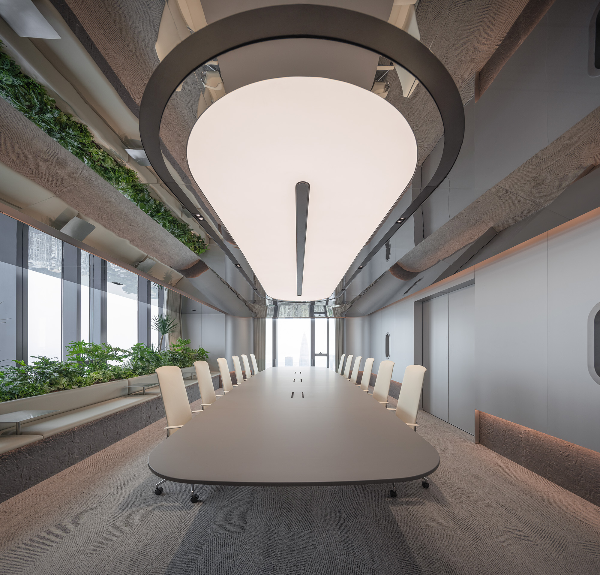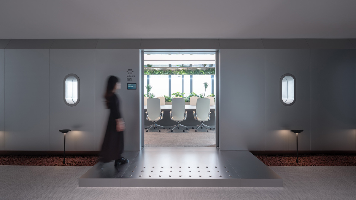 接待会议室的墙面上嵌入了太空舱的圆形舷窗,透过舷窗,看到的不是冰冷的设备,而是精心布置的绿植景观——这是对未来生态的隐喻。