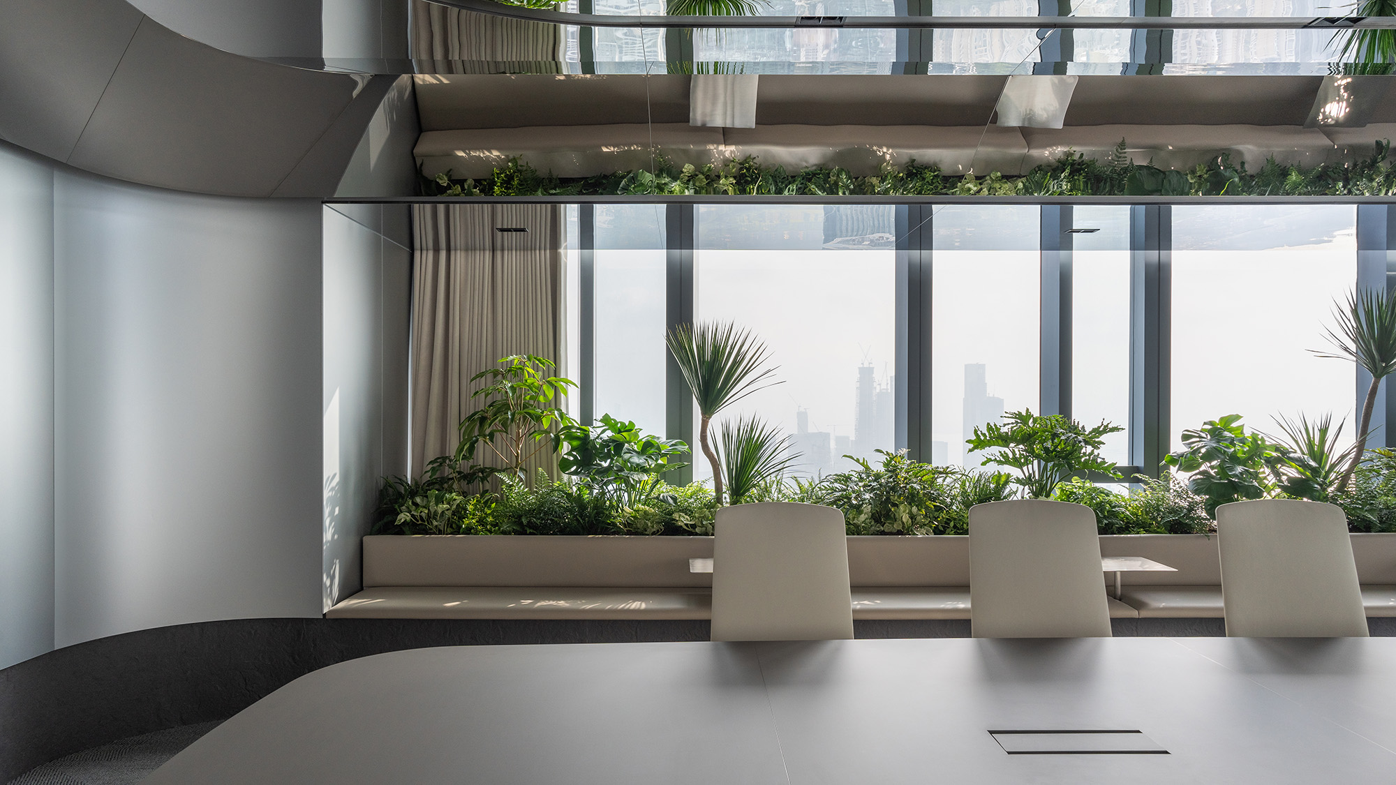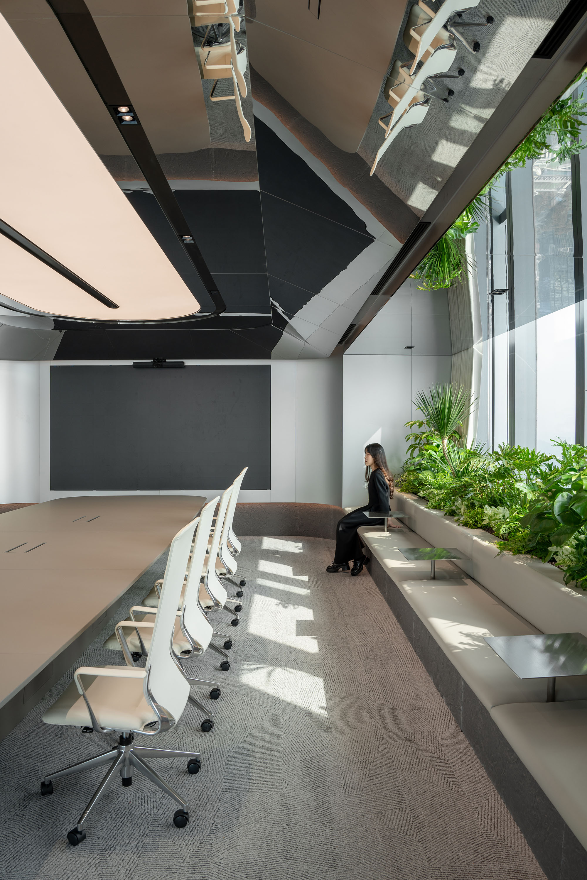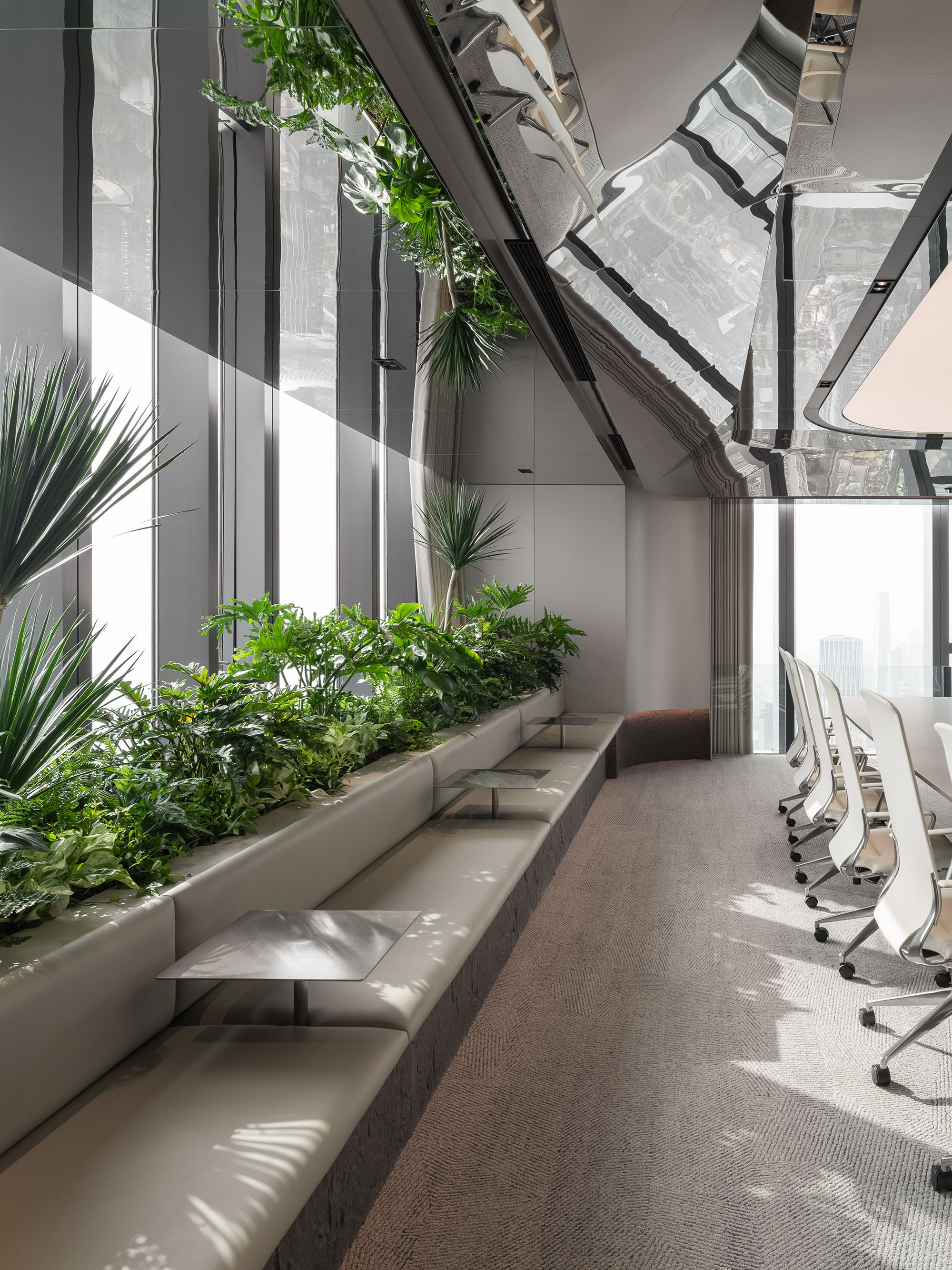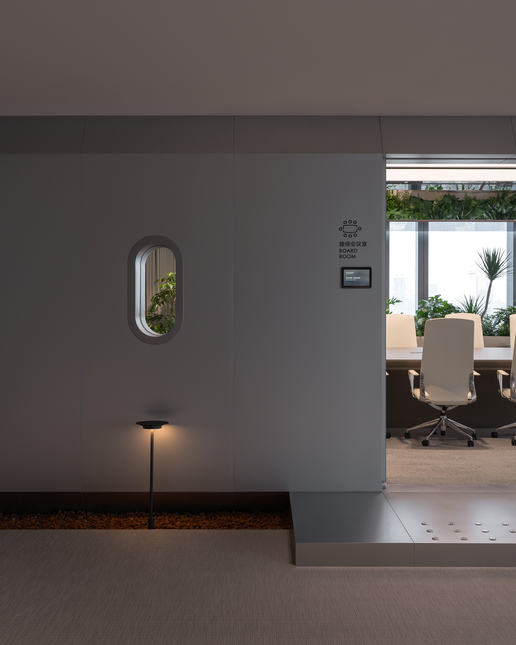 接待会议室的墙面上嵌入了太空舱的圆形舷窗,透过舷窗,看到的不是冰冷的设备,而是精心布置的绿植景观——这是对未来生态的隐喻。
