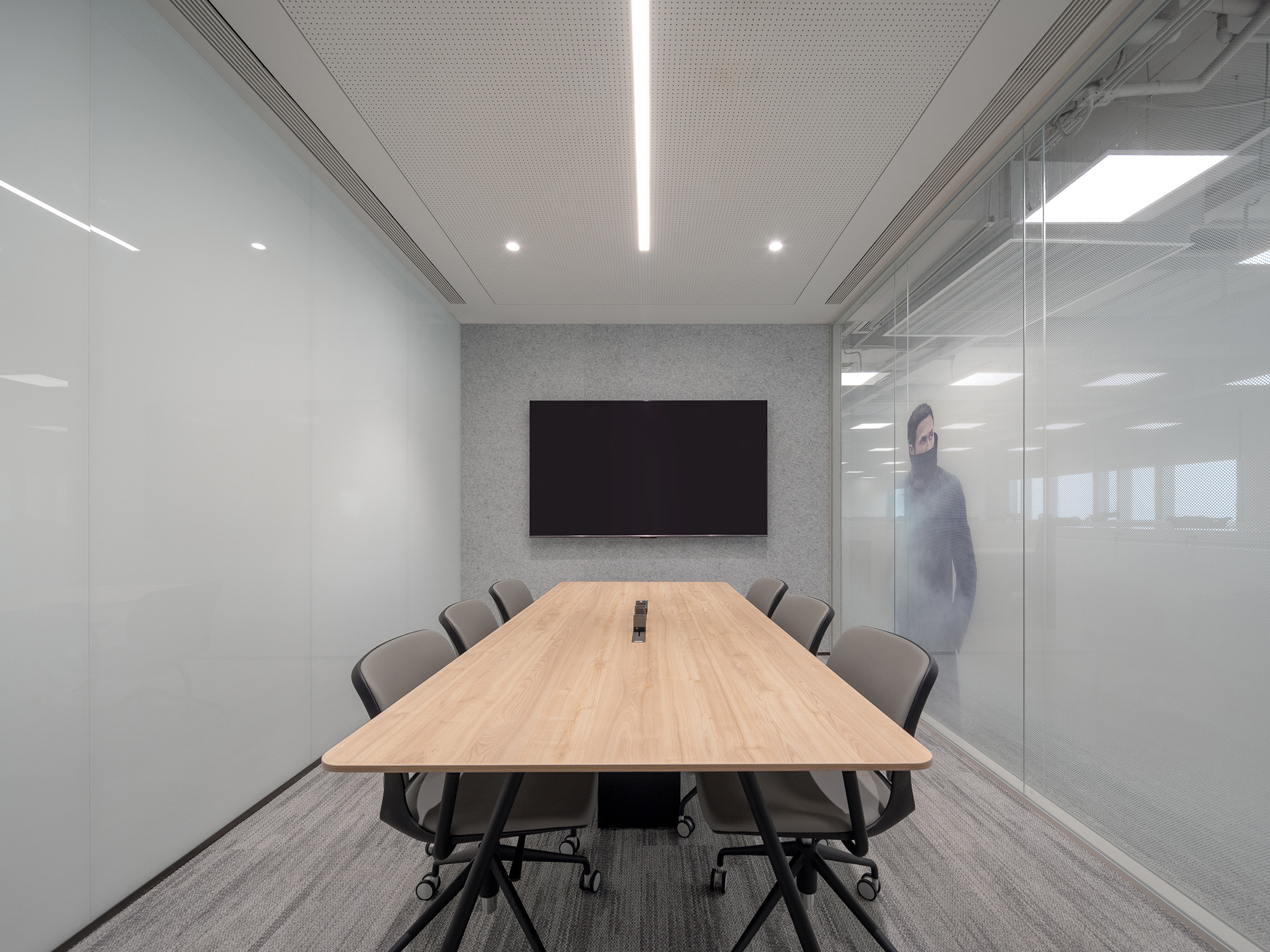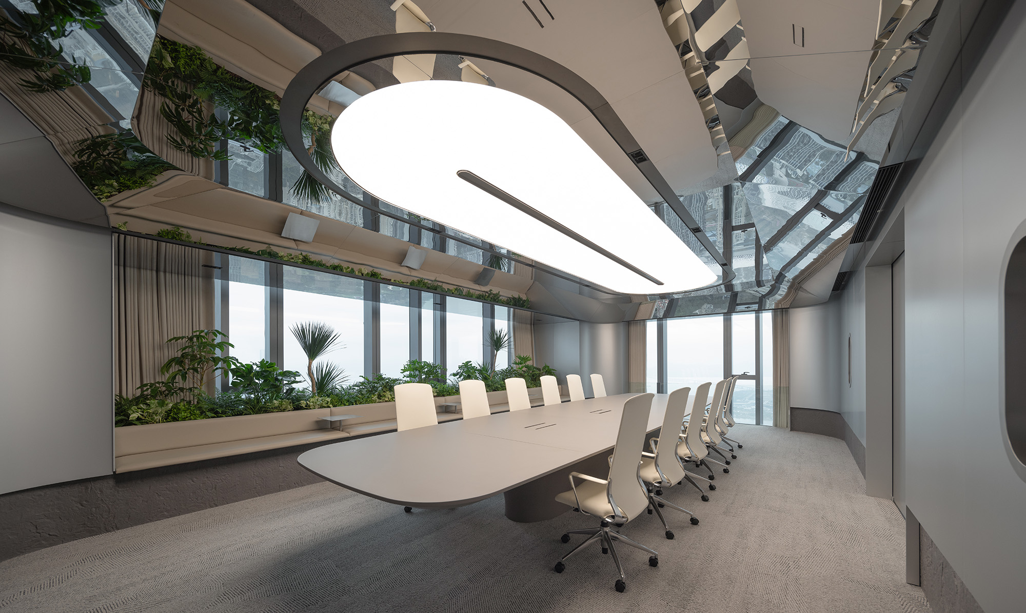 紧邻接待区的会议室,内部空间设计延续了“舰桥指挥舱”的气质。定制的镜面天花呼应了接待区未来科技感的空间调性,可调光的造型灯膜同时模拟了星环的形态,且在一定程度上让视觉空间更显大气开阔。