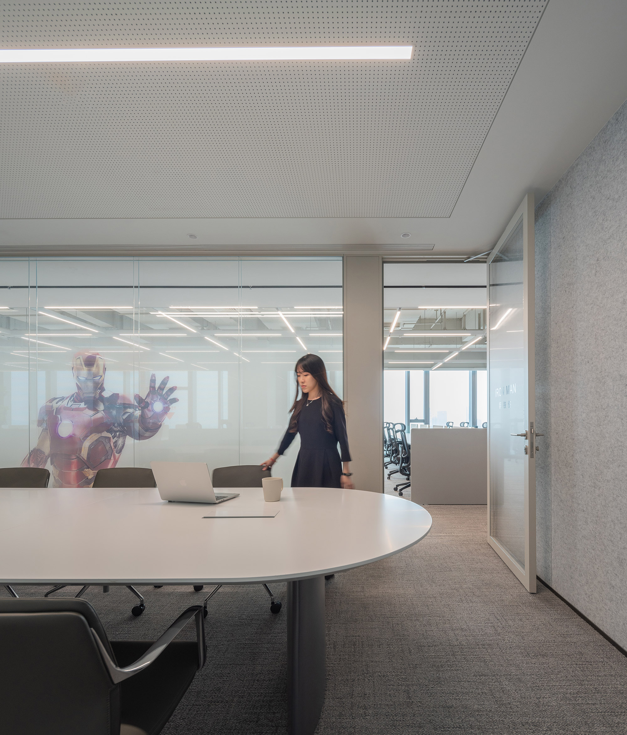 中小型会议室,它们像一个个漂浮在空间中的“太空舱模块”。内部使用了大量的毛毡吸音板,不仅是为了声学舒适度,更是因为那种毛茸茸的触感,能中和科技带来的冷峻,给思维碰撞提供一个柔软的“茧”。在这里,灵感不再被墙壁困住。