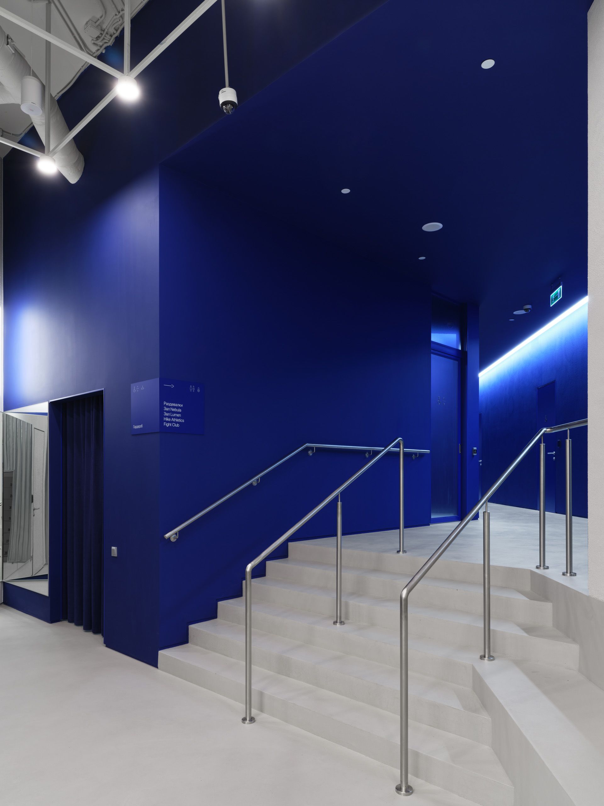 · 淋浴与更衣室:简洁的线条、混凝土、深蓝色天花板、富有戏剧性的灯光——这里是重置与过渡的空间。