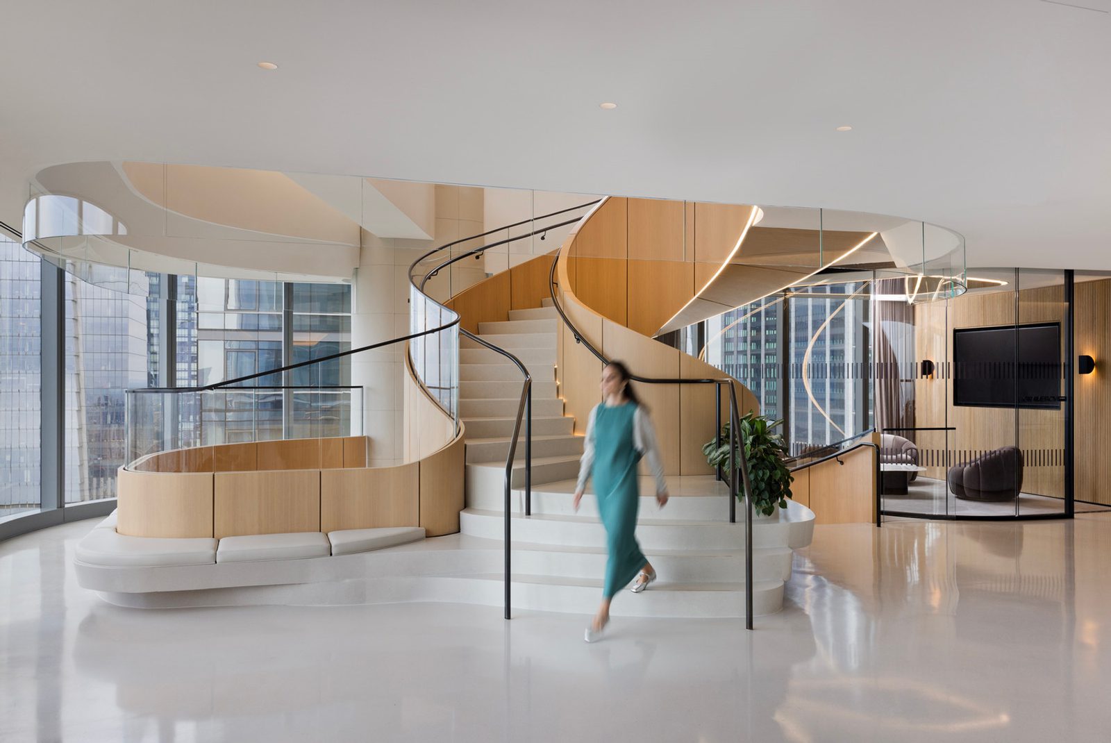 设计灵感源自纽约的独特节奏与文化底蕴,将温暖、精致与可持续理念贯穿于每一处细节。灵活的办公布局、一体化的配套设施以及亲生物设计,共同促进了协作与身心健康;而一座引人瞩目的中央楼梯,则在物理空间与社交层面将四个楼层紧密相连。