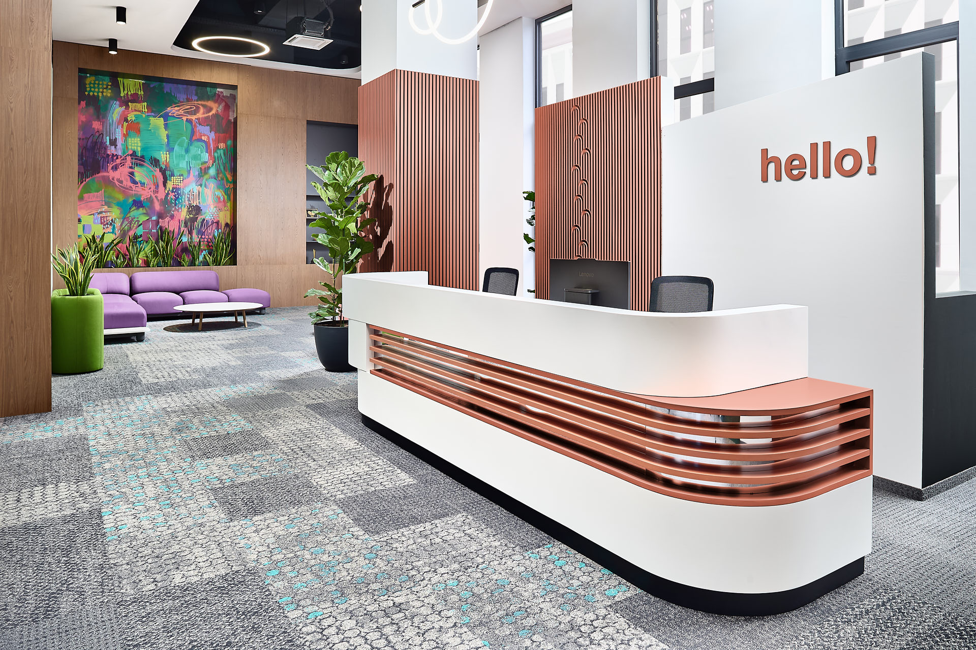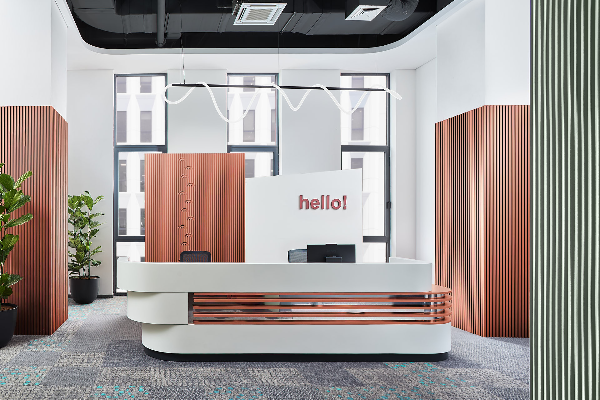 迎宾区被设计为一个开放且界限清晰的接待空间,用于迎接访客与员工,位于一楼。通过宁静的色调与点缀色彩的搭配,该区域形成了人们对办公室的第一印象,并为整个空间奠定了氛围基调。
