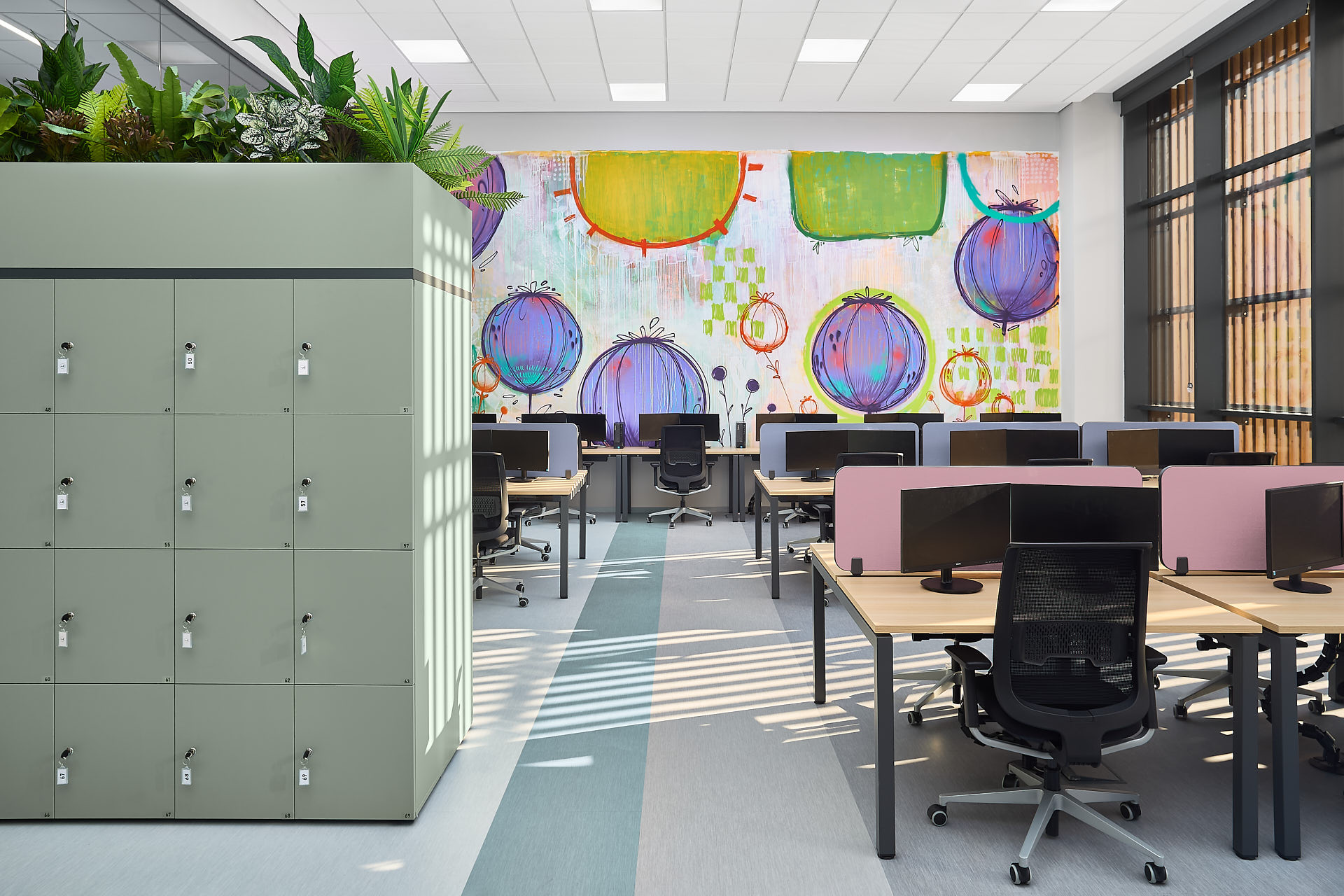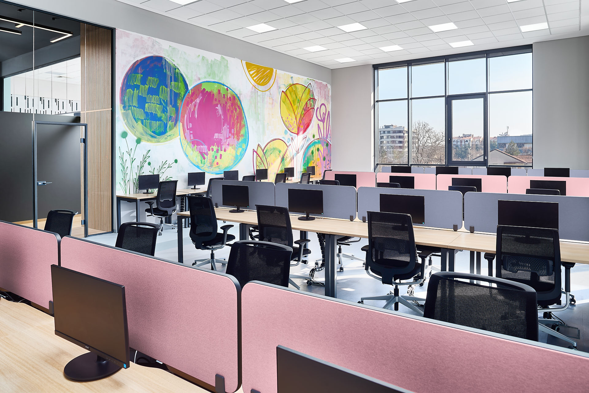 “空间的视觉识别通过手工绘制的壁画和定制印花得到了进一步增强,而声学舒适度则通过整合多种声学产品得以实现。空间中布置了精心挑选的绿植、多样化的植物和苔藓,它们营造出和谐的视觉平衡,改善了室内微气候,并有助于形成愉悦、宁静且鼓舞人心的工作氛围。”——建筑师兼项目经理伊莉娜·米罗诺斯卡如是说。
