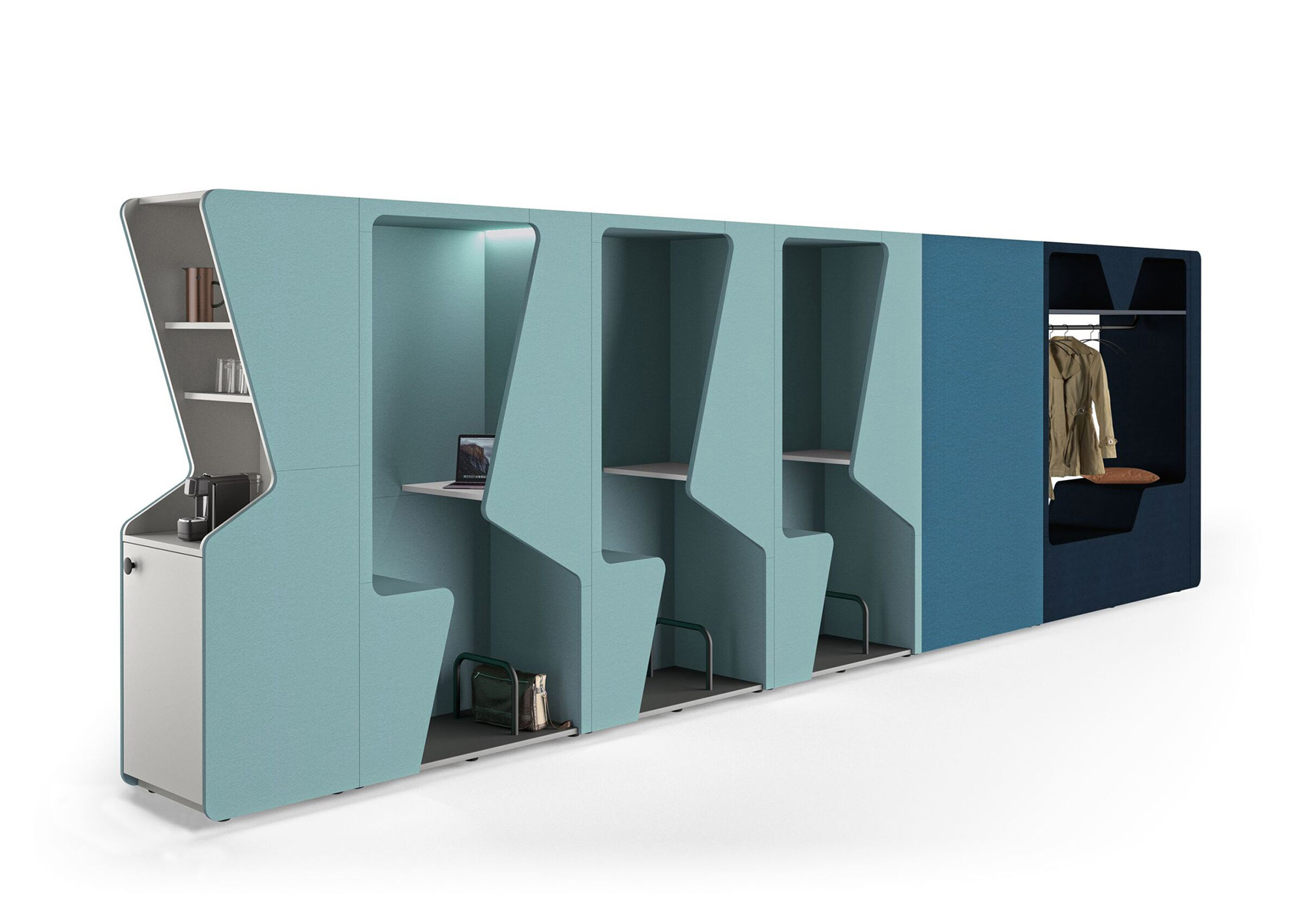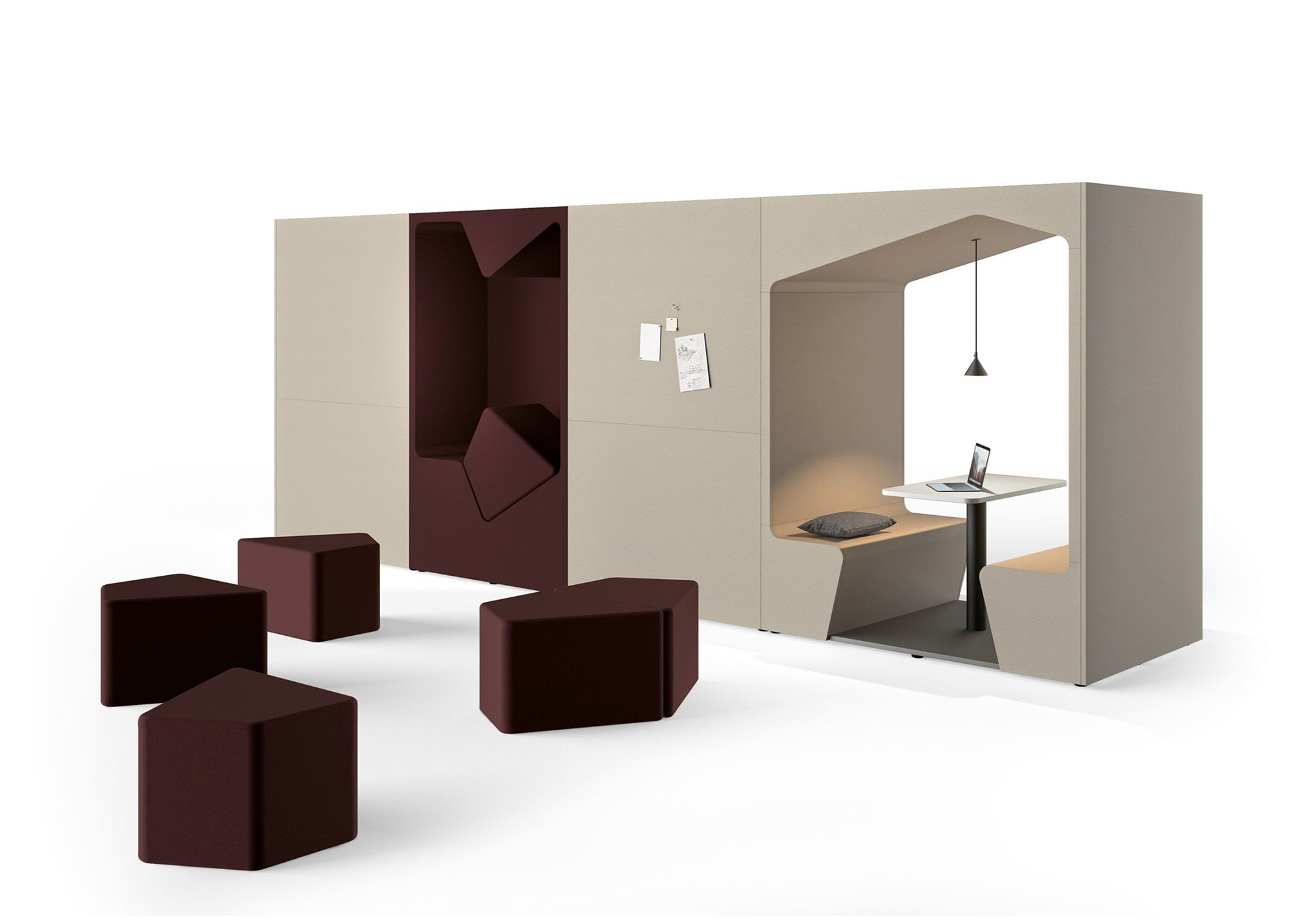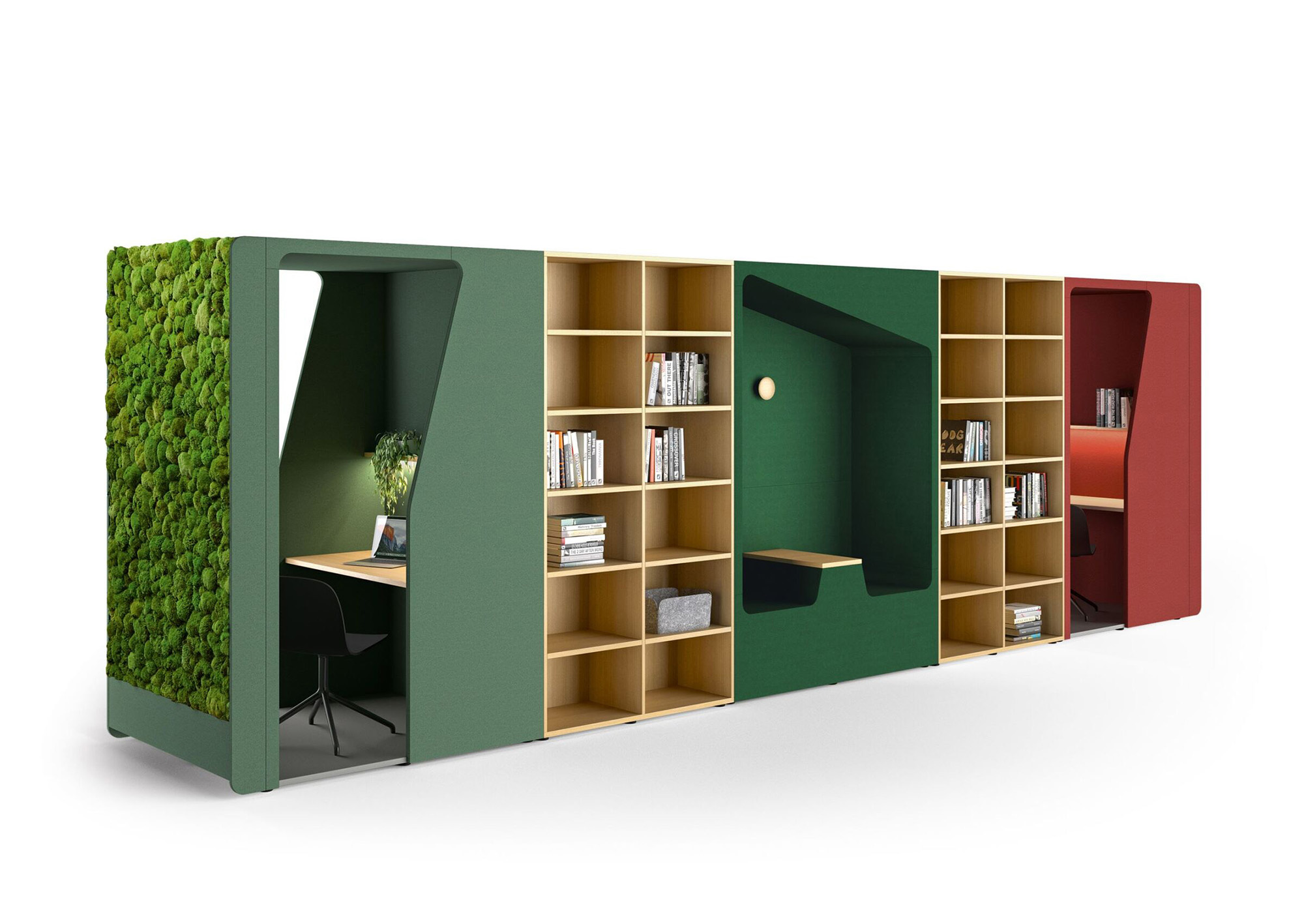 作为墙面艺术装饰或空间分隔装置,“跑酷”系列柜式工作舱以其织物质感的外观,为现代开放式办公空间注入居家般的温暖气息。其前后装饰板均完全采用织物覆面,表面亦可兼作灵感钉板。配合与之协调的软包组件,“跑酷”整体呈现出和谐统一、充满创意、并富有愉悦感的美学形态。该产品系列提供“werner works”标准单色饰面。除九种纯色饰面外,定制化单元还提供多种天然木饰面的选择。