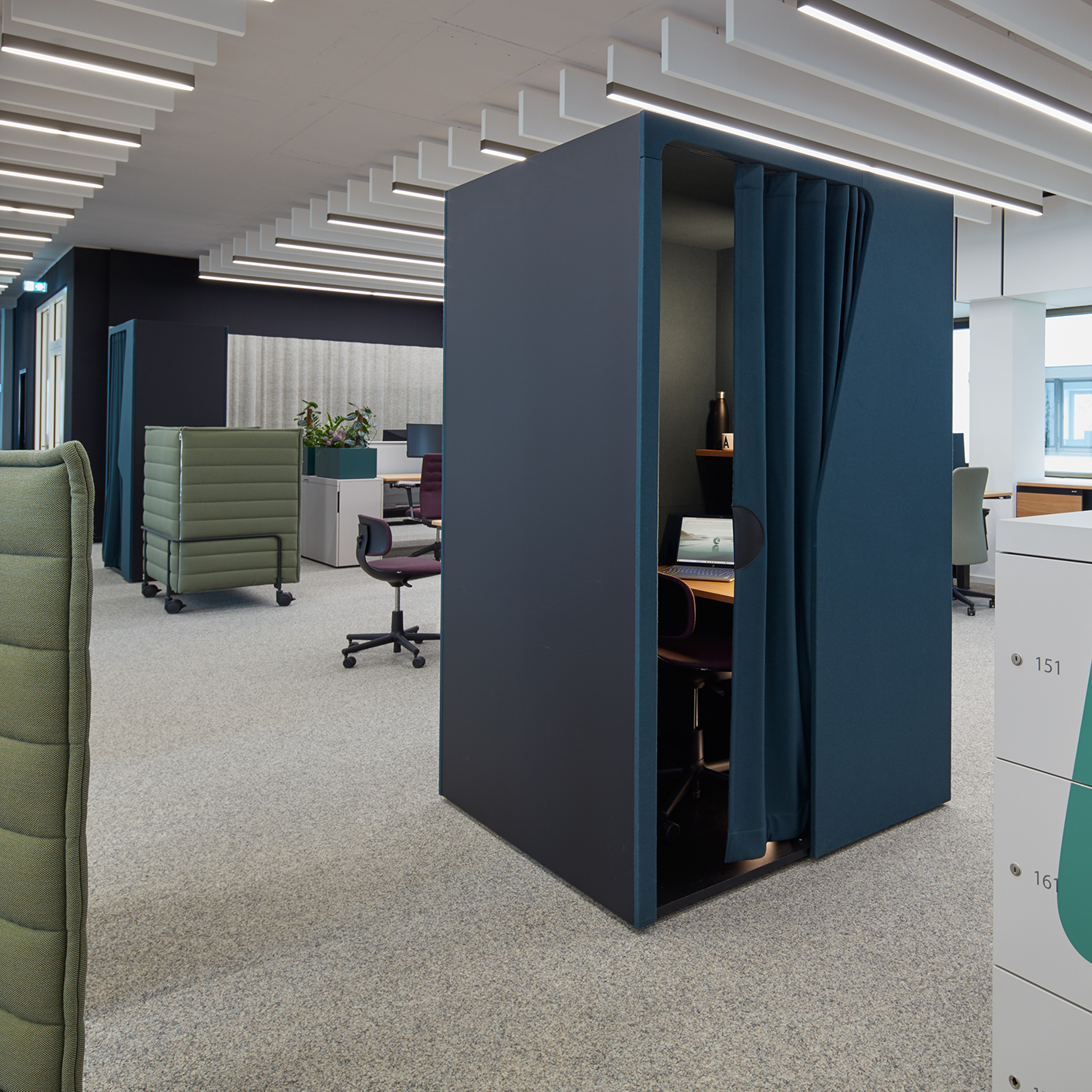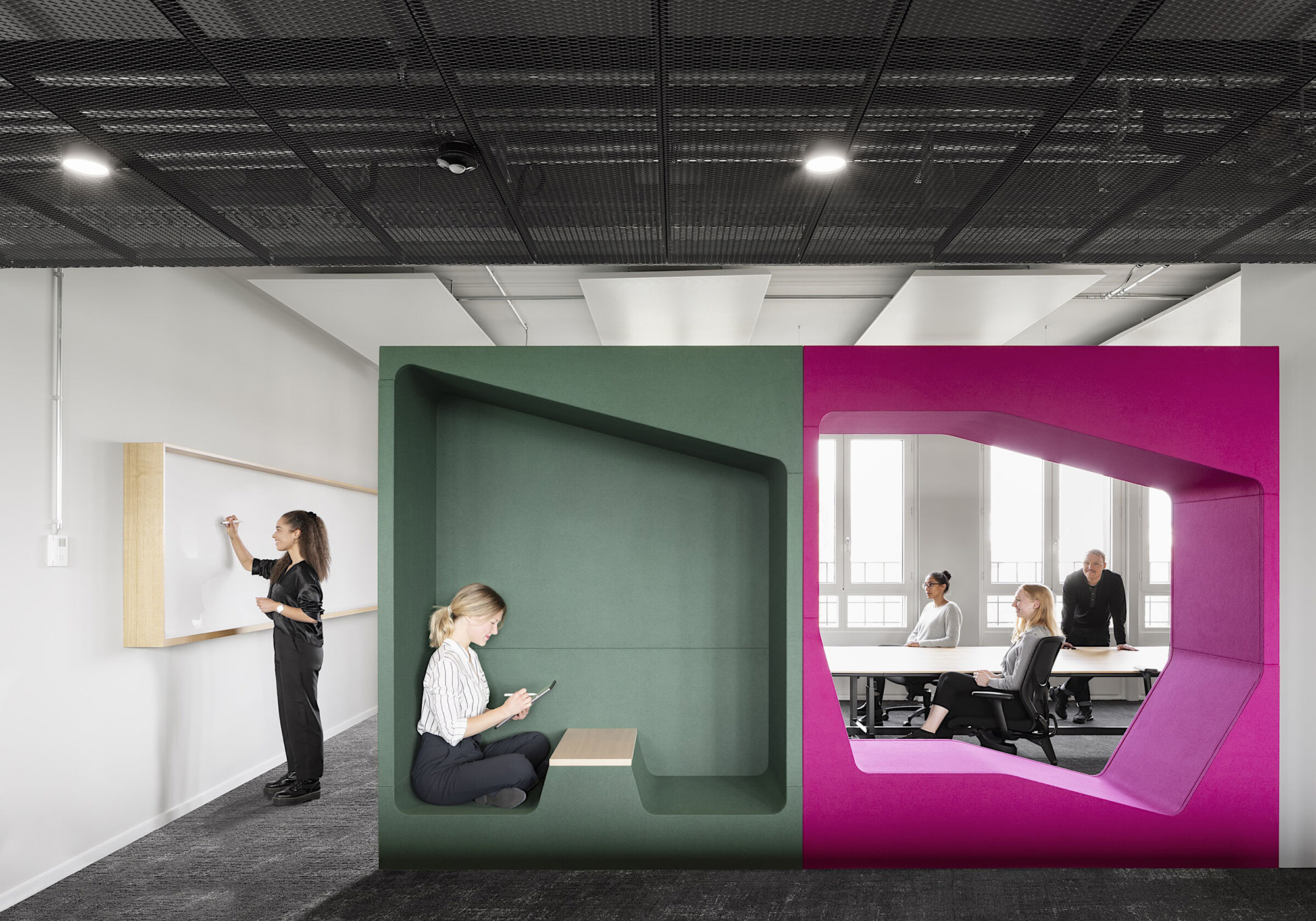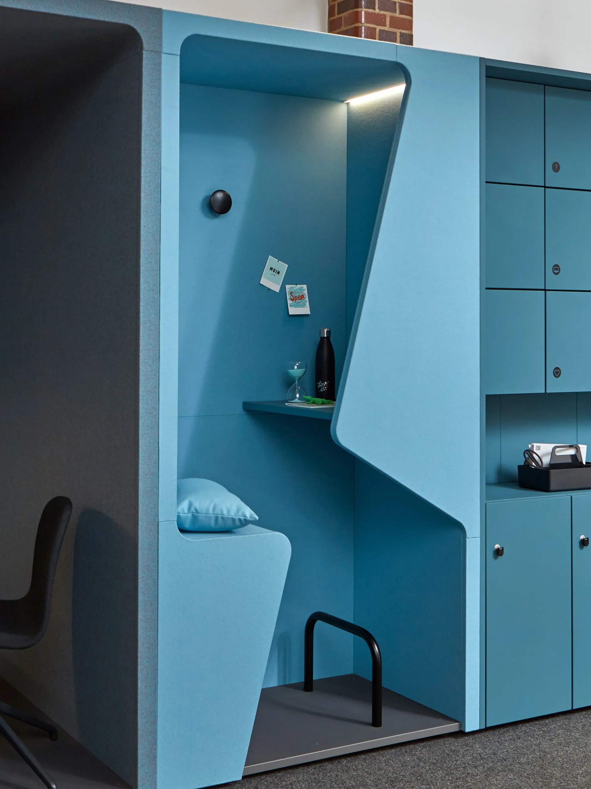 作为墙面艺术装饰或空间分隔装置,“跑酷”系列柜式工作舱以其织物质感的外观,为现代开放式办公空间注入居家般的温暖气息。其前后装饰板均完全采用织物覆面,表面亦可兼作灵感钉板。配合与之协调的软包组件,“跑酷”整体呈现出和谐统一、充满创意、并富有愉悦感的美学形态。该产品系列提供“werner works”标准单色饰面。除九种纯色饰面外,定制化单元还提供多种天然木饰面的选择。