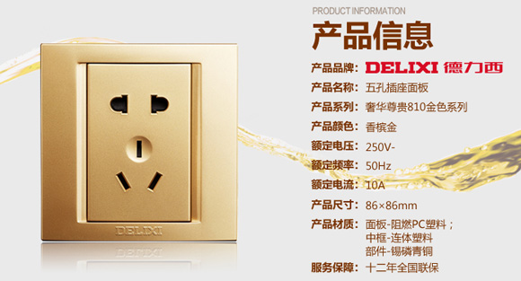 德力西 CD810 香槟金色开关插座,线条流畅,简约舒展;香槟金色奢华而大气。每一个细节都为您量身定做。