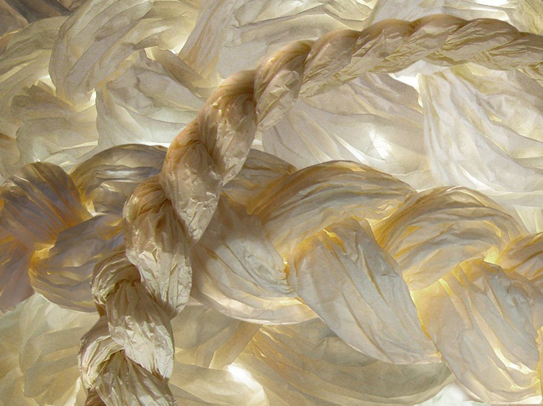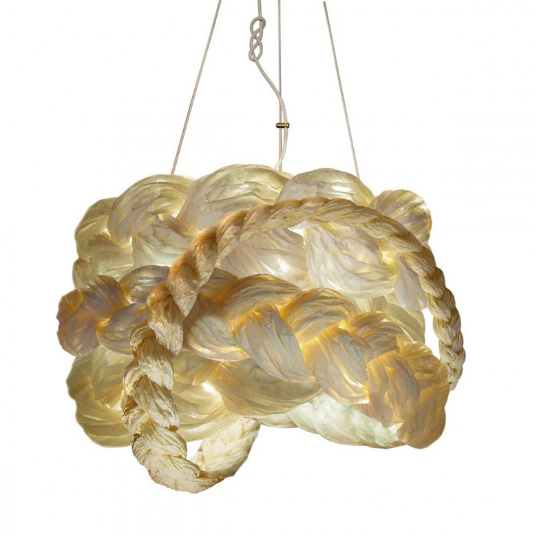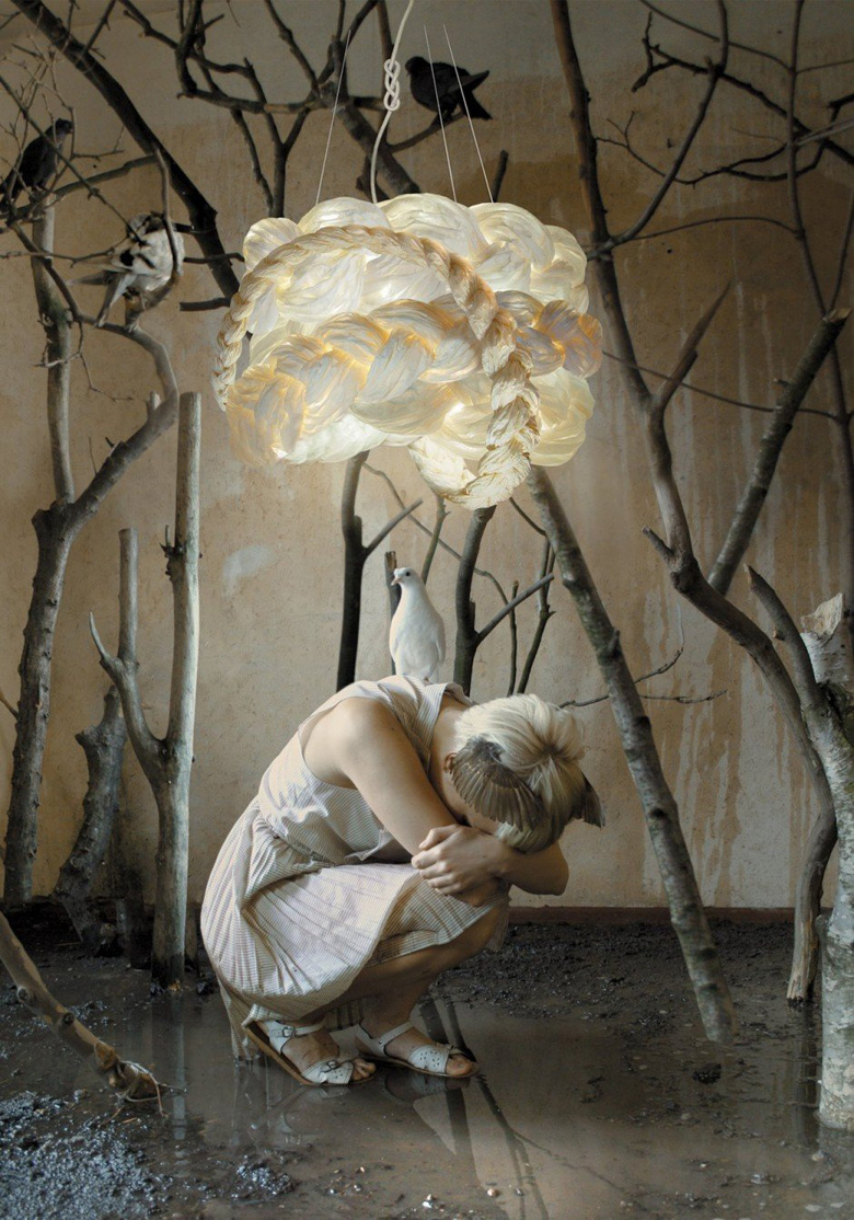 拉脱维亚设计工作室mammalampa设计的灯具组合,有着非常迷人的名称:新娘。有吊灯、地灯以及台灯三种系列。“新娘”的外衣采用柔软的纸张,经过褶皱与编织的双重肌理令灯光散发出迷幻的魅影,轻盈的体量感营造出象出嫁的少女般特殊意境。世界上没有一模一样的新娘,因此纯手工制作的每一件灯具都是唯一。